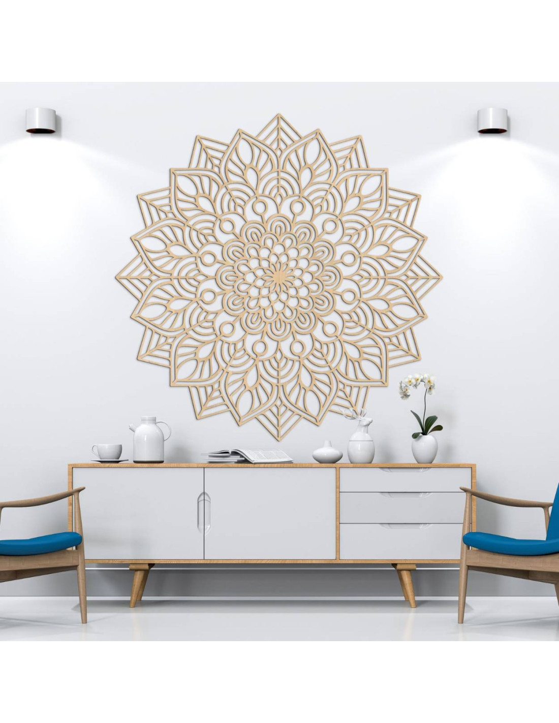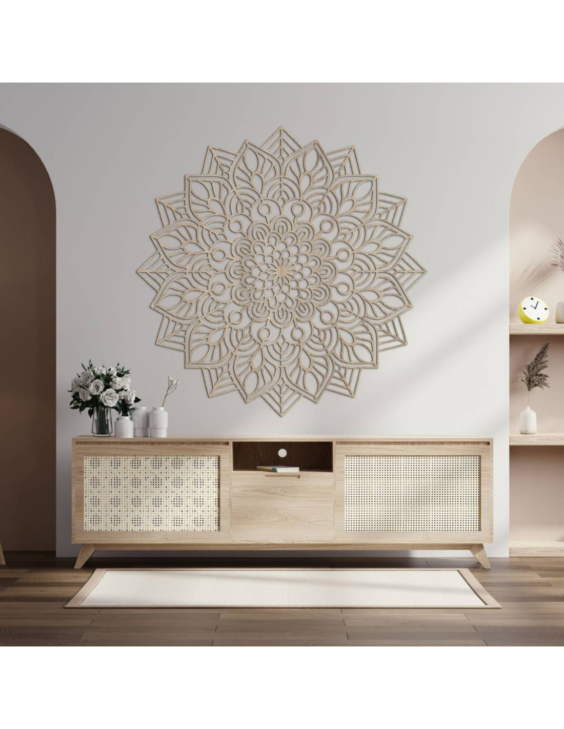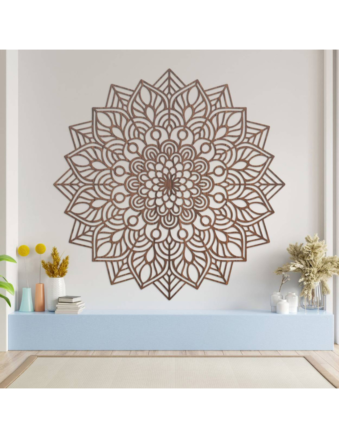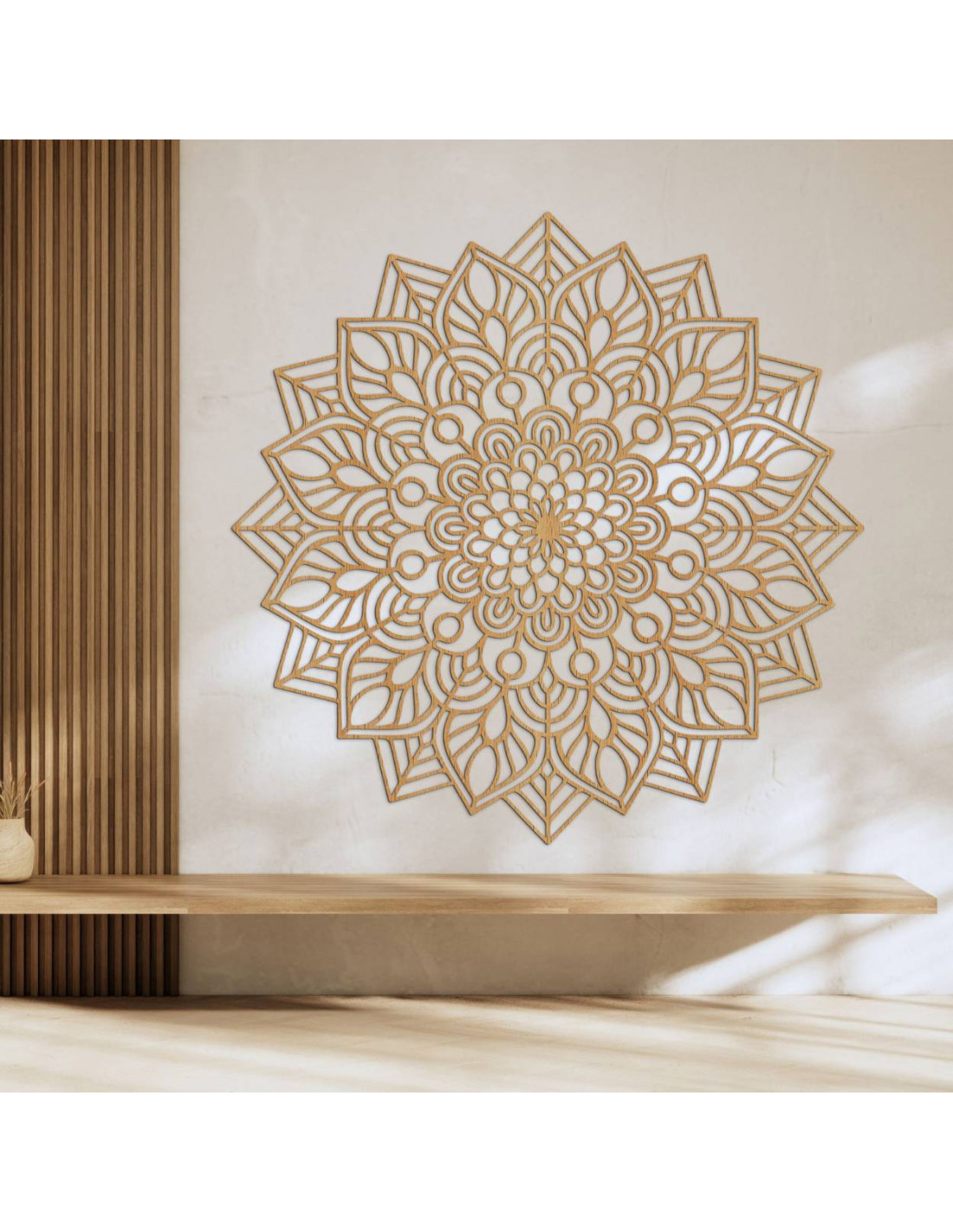 Dřevěná mandala na zeď vnáší do interiéru eleganci, preciznost a harmonii .