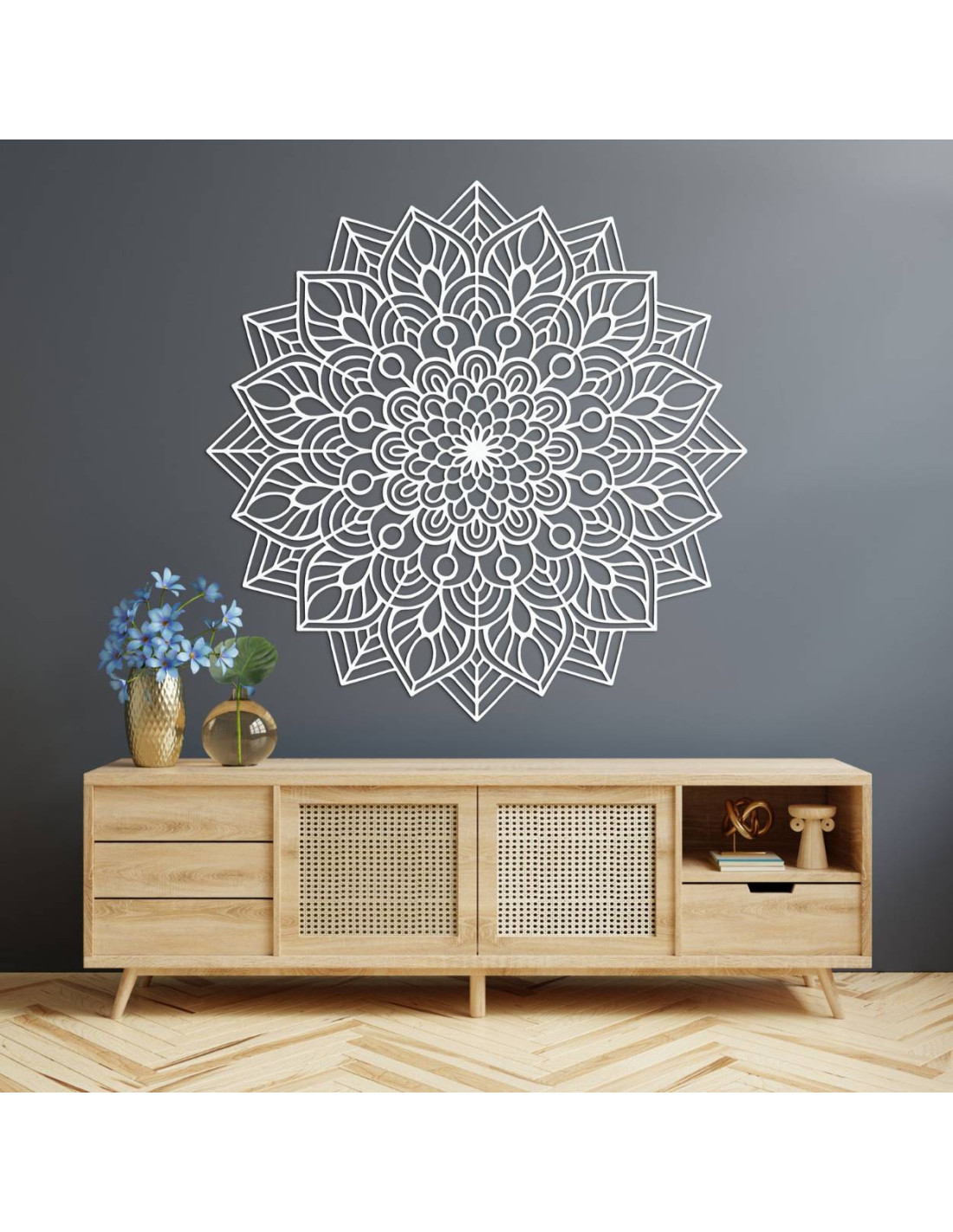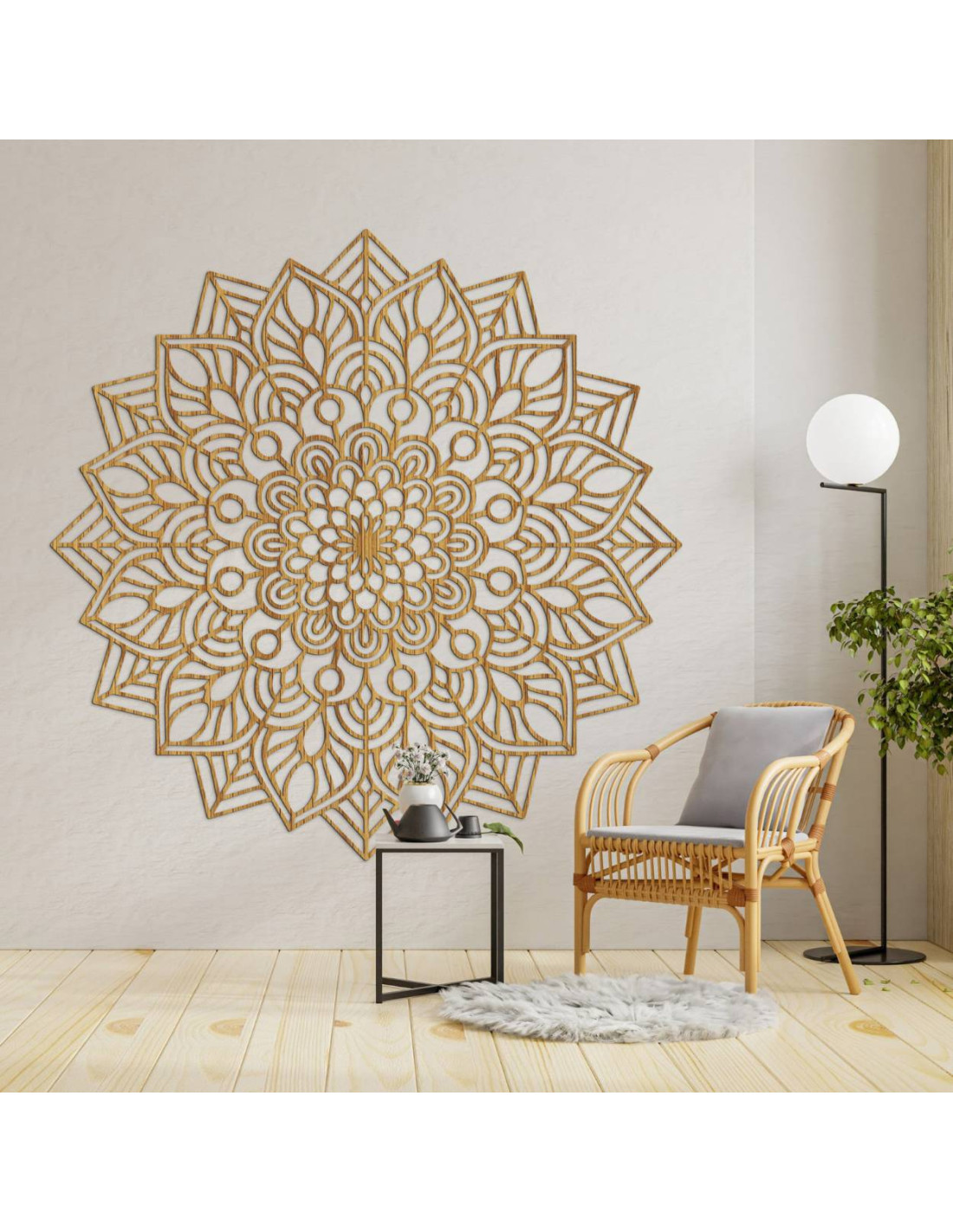 Tato elegantní dřevěná mandala na zeď je dokonalým spojením precizního řemesla a harmonického designu. Její jemně propracovaná geometrická struktura působí jako vizuální poezie – vrstvy tvarů, které se prolínají do jednoho vyváženého celku.