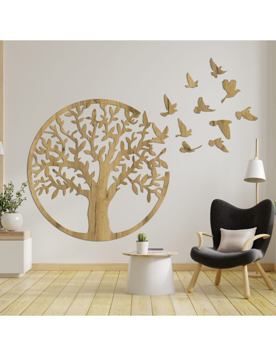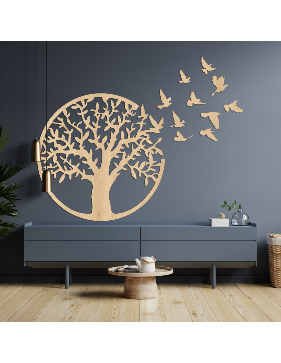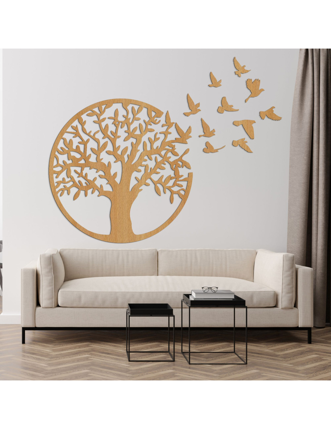 Oživte svůj interiér elegantní dřevěnou nástěnnou dekorací, která zachycuje krásu stromu se vzlétajícími ptáky. Toto jedinečné umělecké dílo je ideální pro ty, kteří hledají moderní a přírodní akcenty ve svých prostorách.