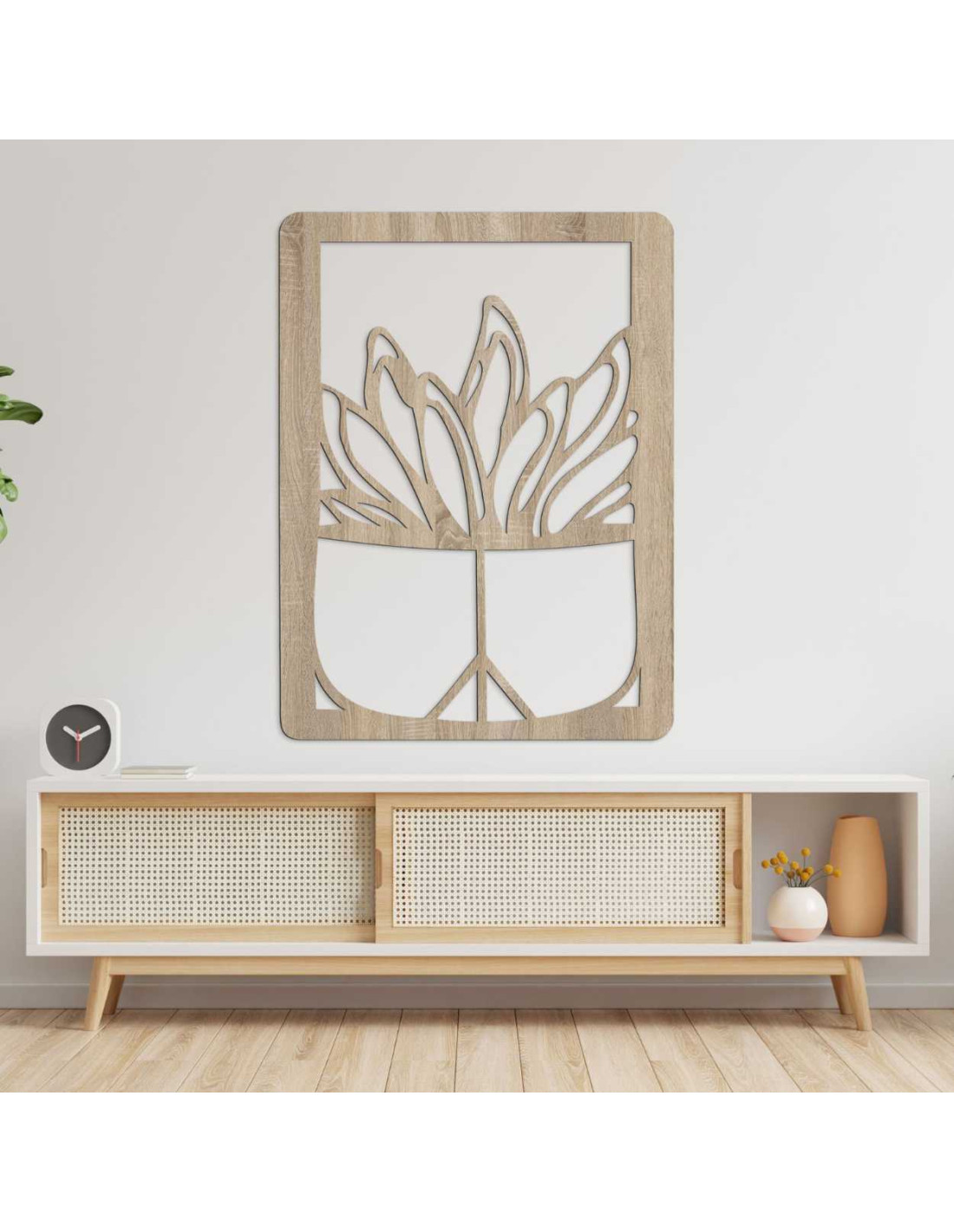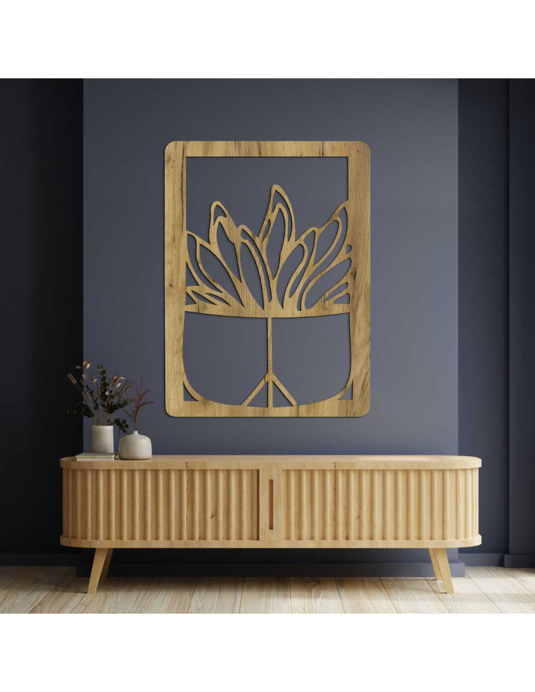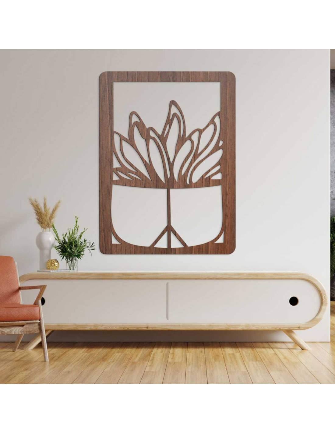 Dřevěný nástěnný obraz – Rostlina v květináči | Moderní dřevořezba do interiéru - GEERA