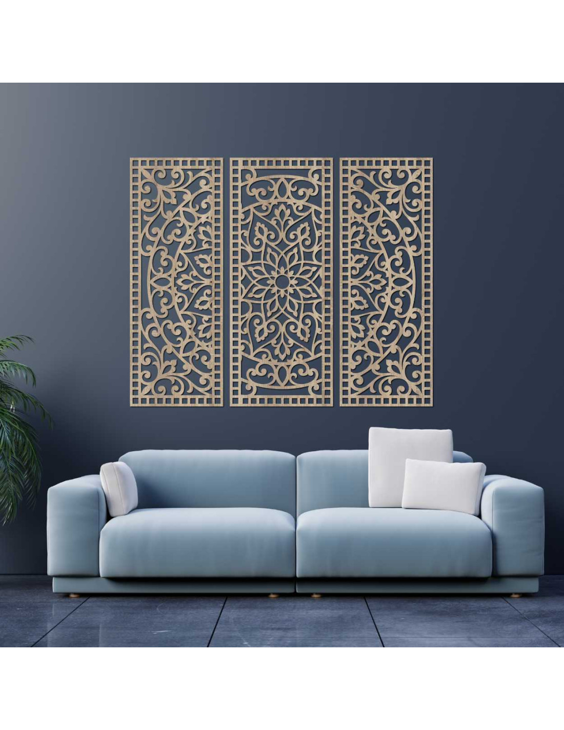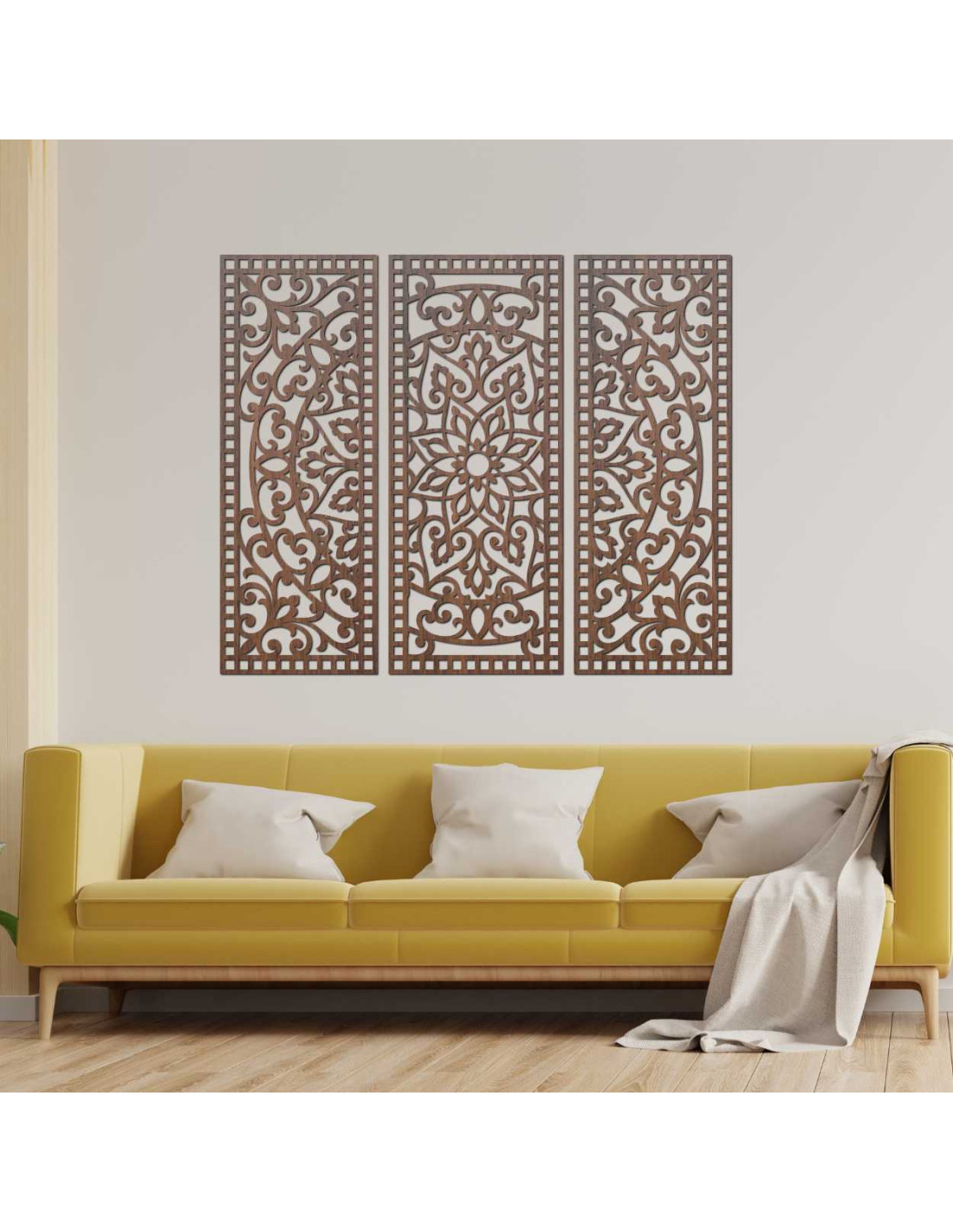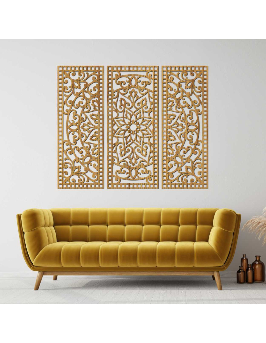 Květinová mandala ze dřeva – boho 3dílná nástěnná dekorace představuje spojení tradičních mandalových vzorů a moderní preciznosti zpracování.