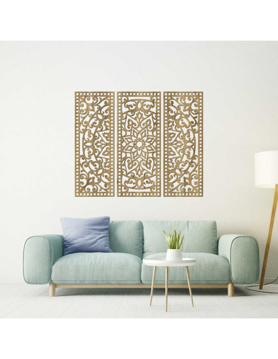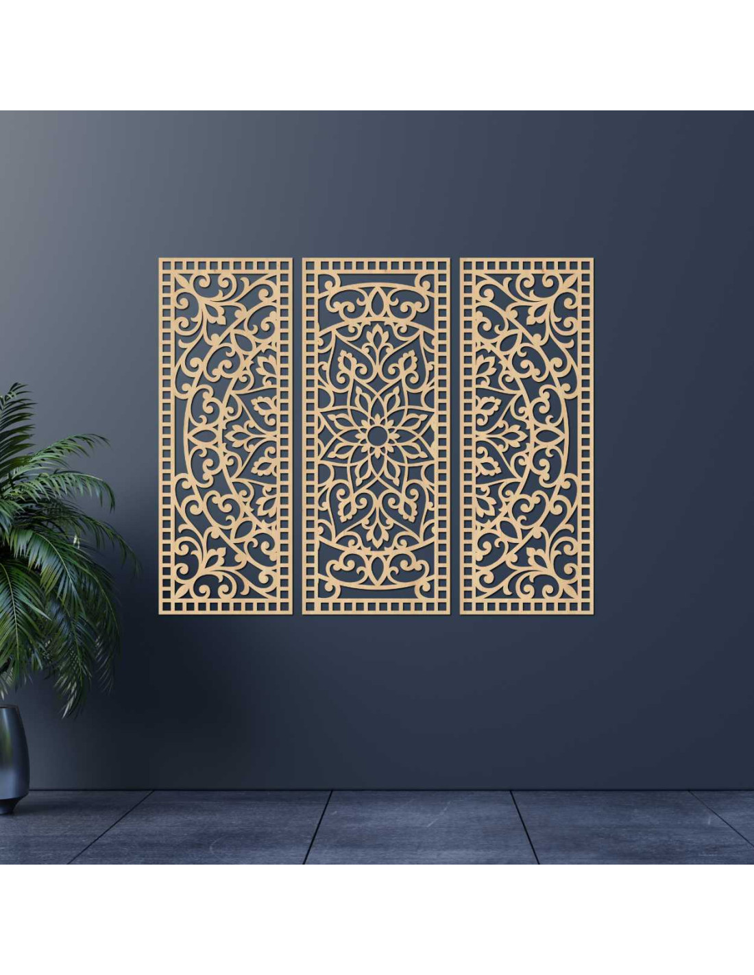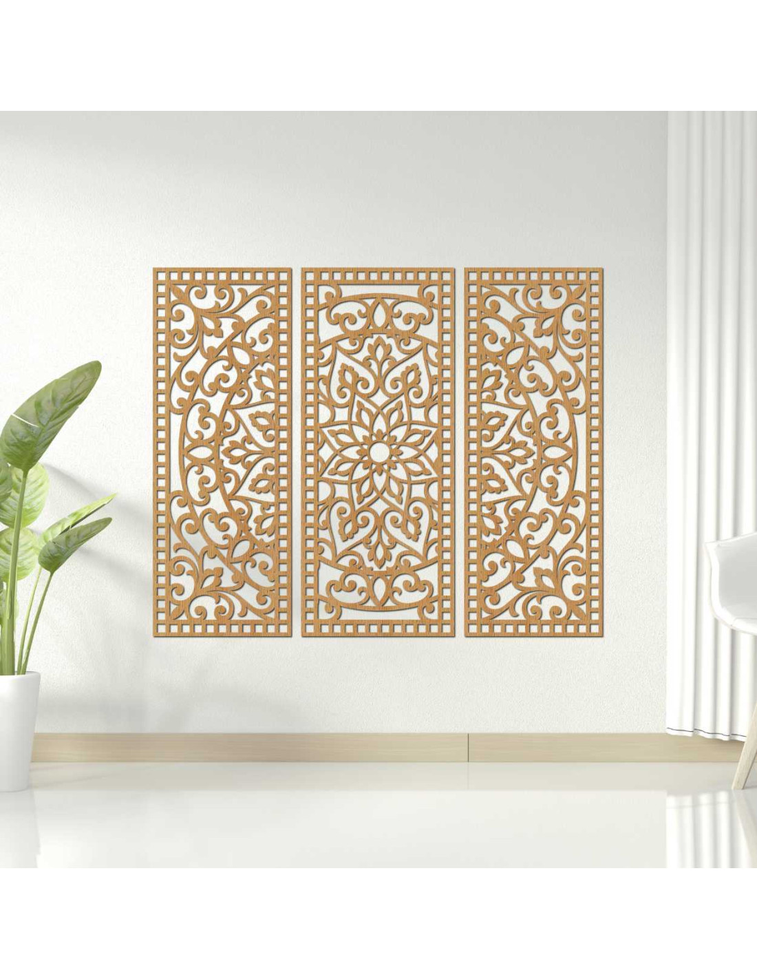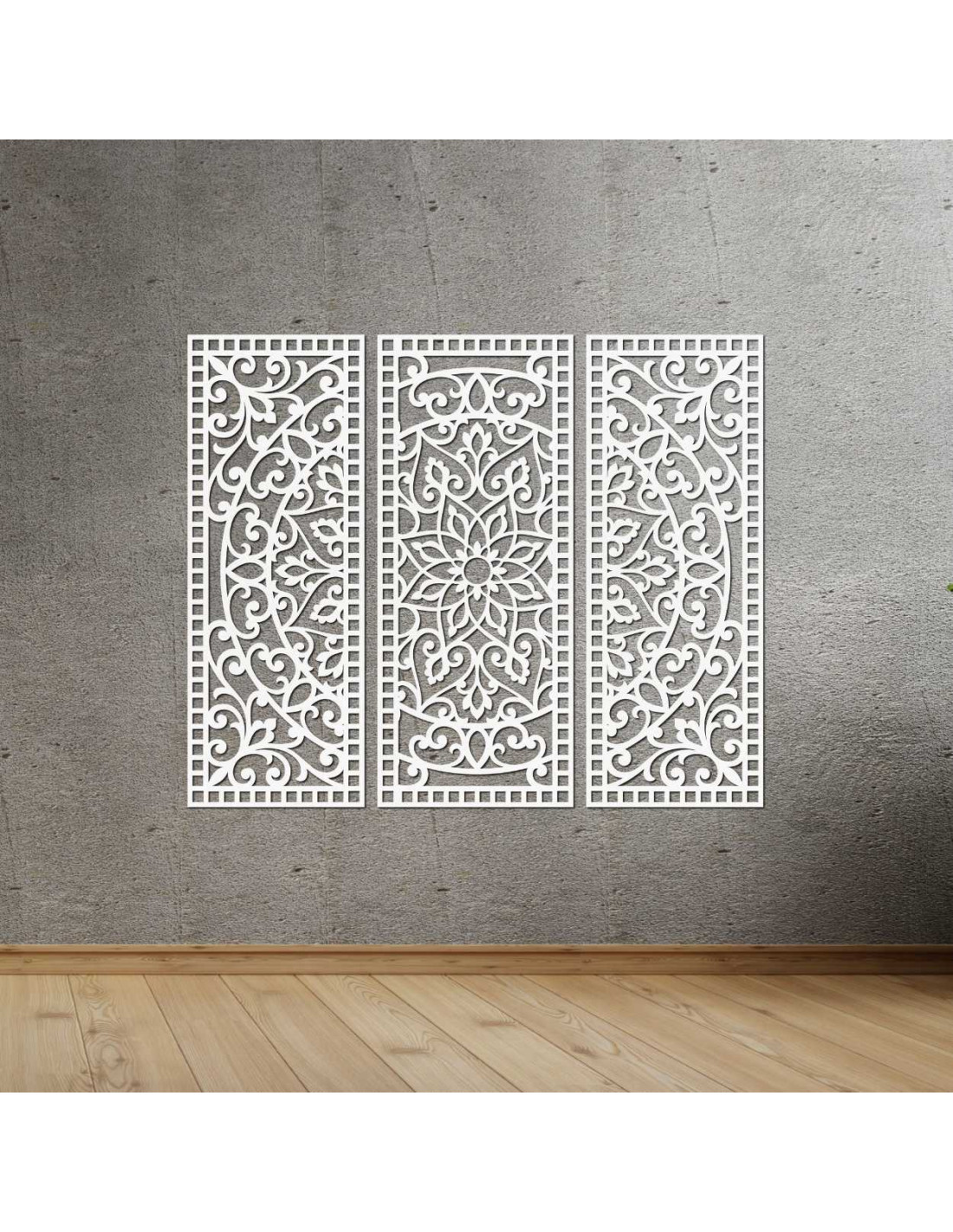 Květinová mandala ze dřeva – boho 3dílná nástěnná dekorace představuje spojení tradičních mandalových vzorů a moderní preciznosti zpracování.