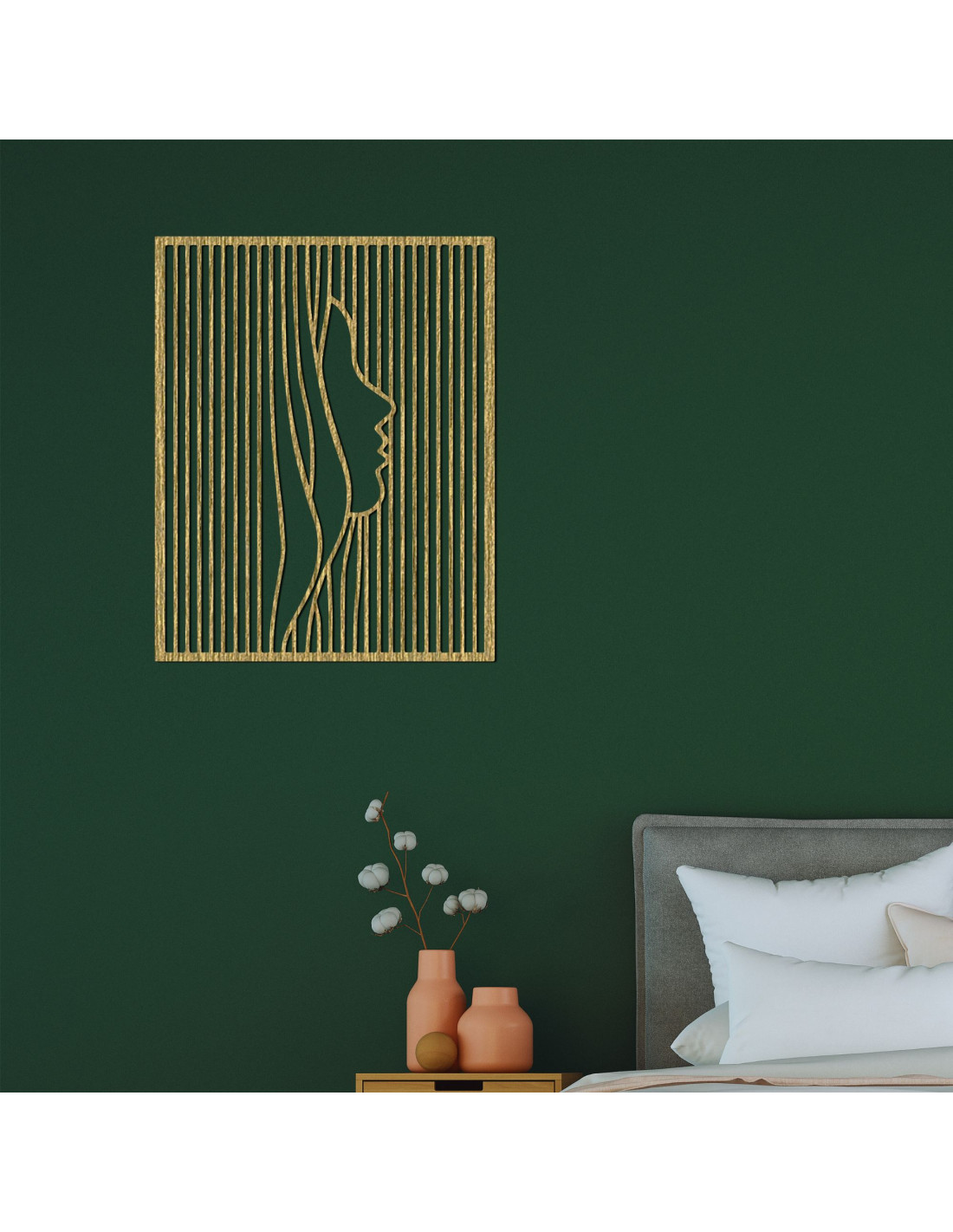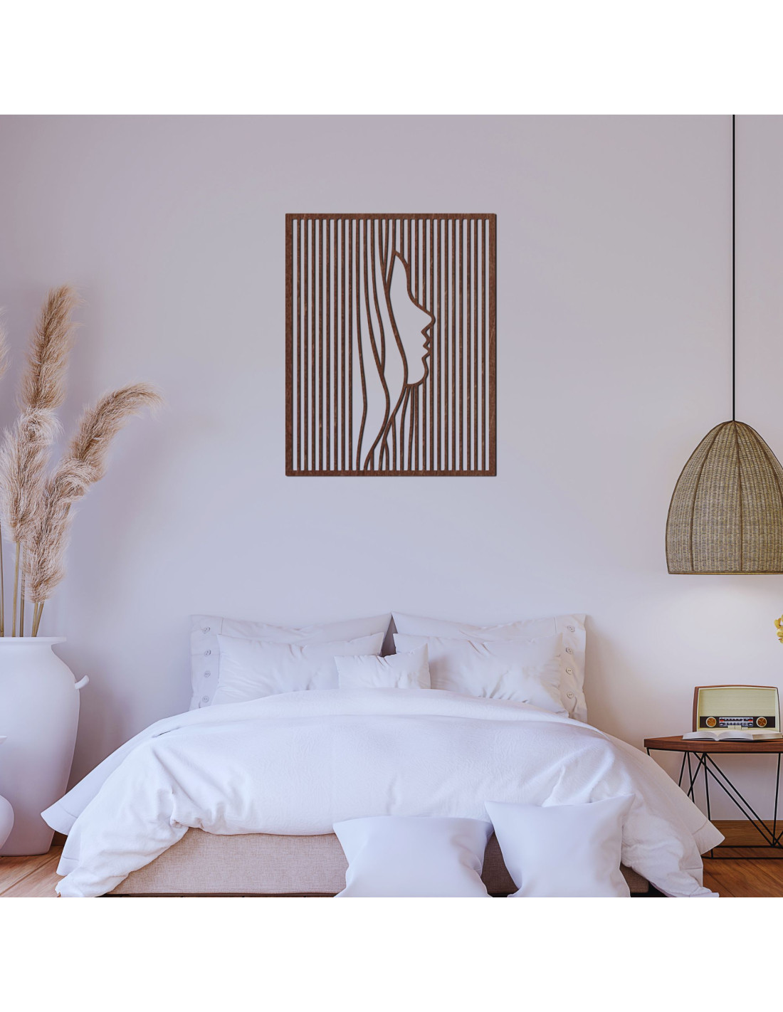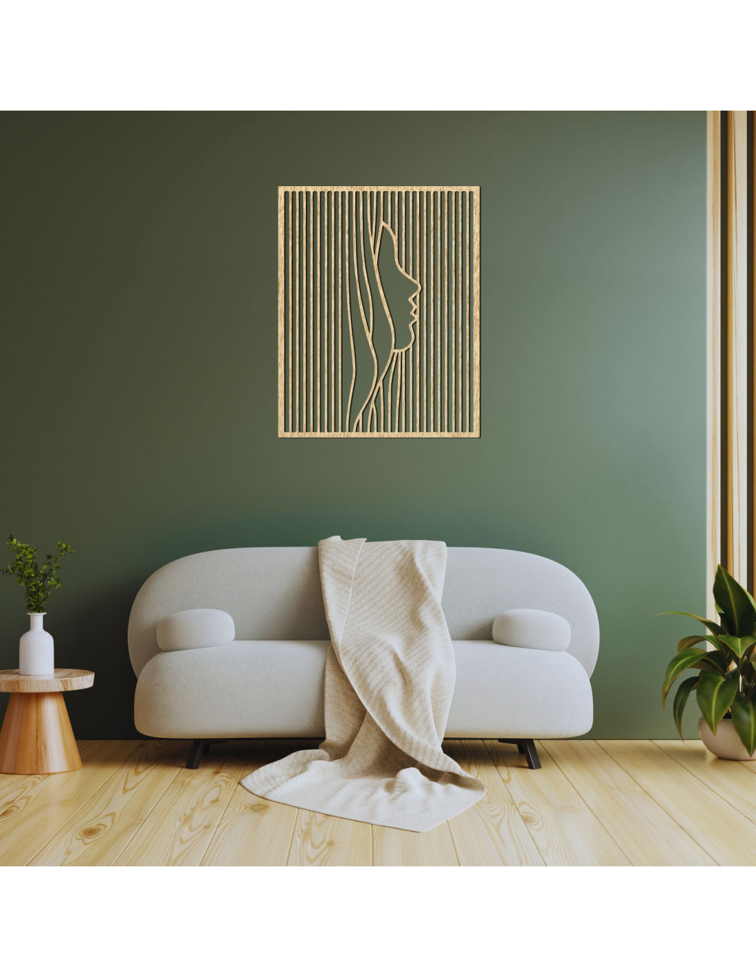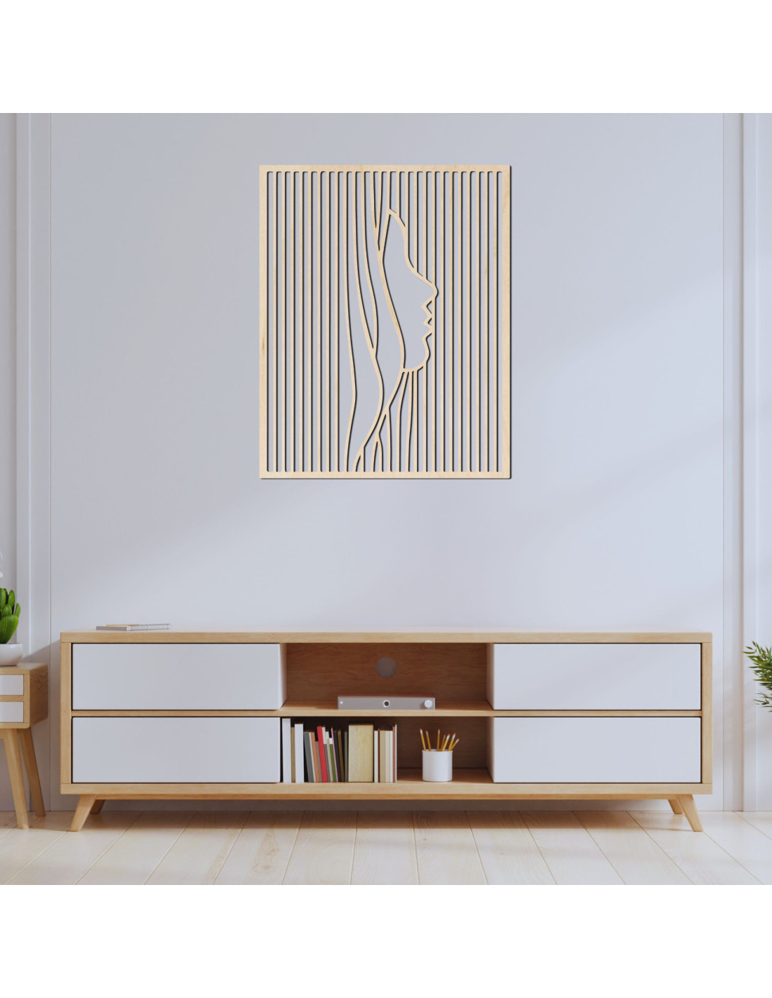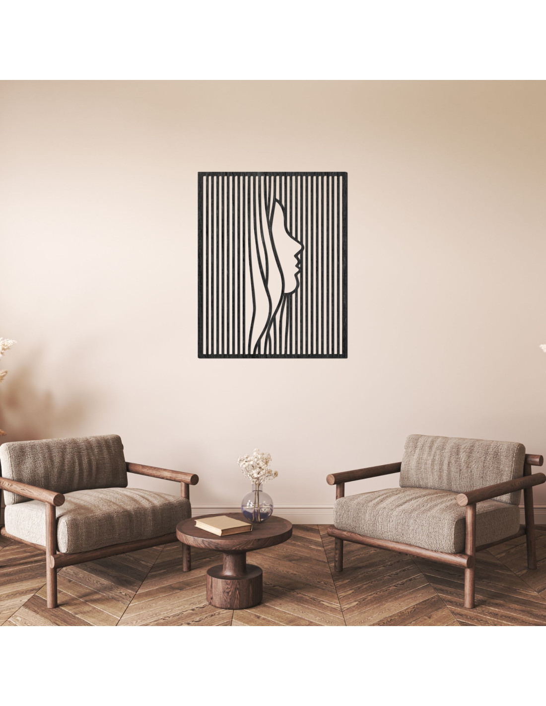 Tento moderní dřevěný obraz spojuje minimalistický design s optickou iluzí, kde se ze zdánlivě obyčejných pruhů vynořuje elegantní silueta obličeje.