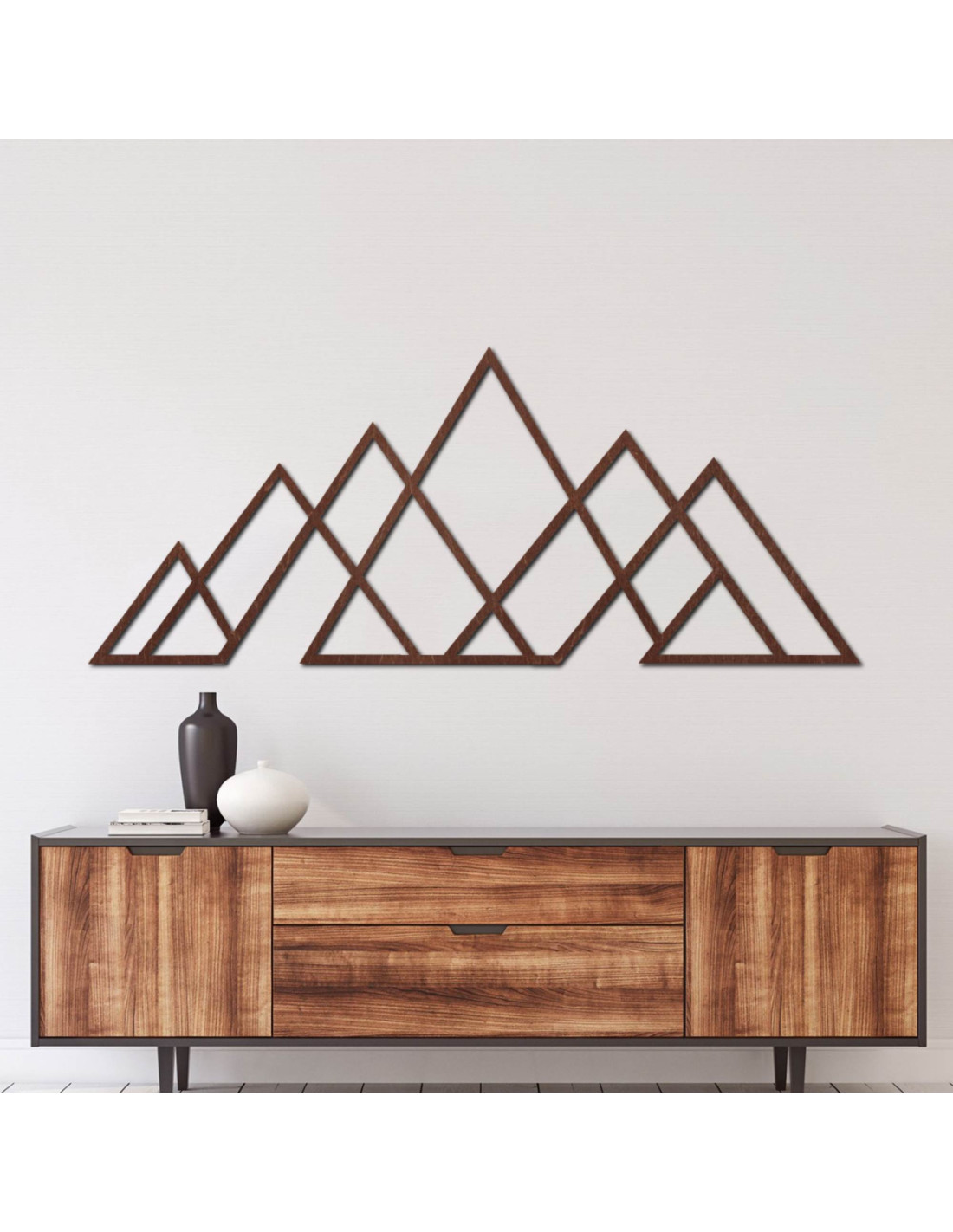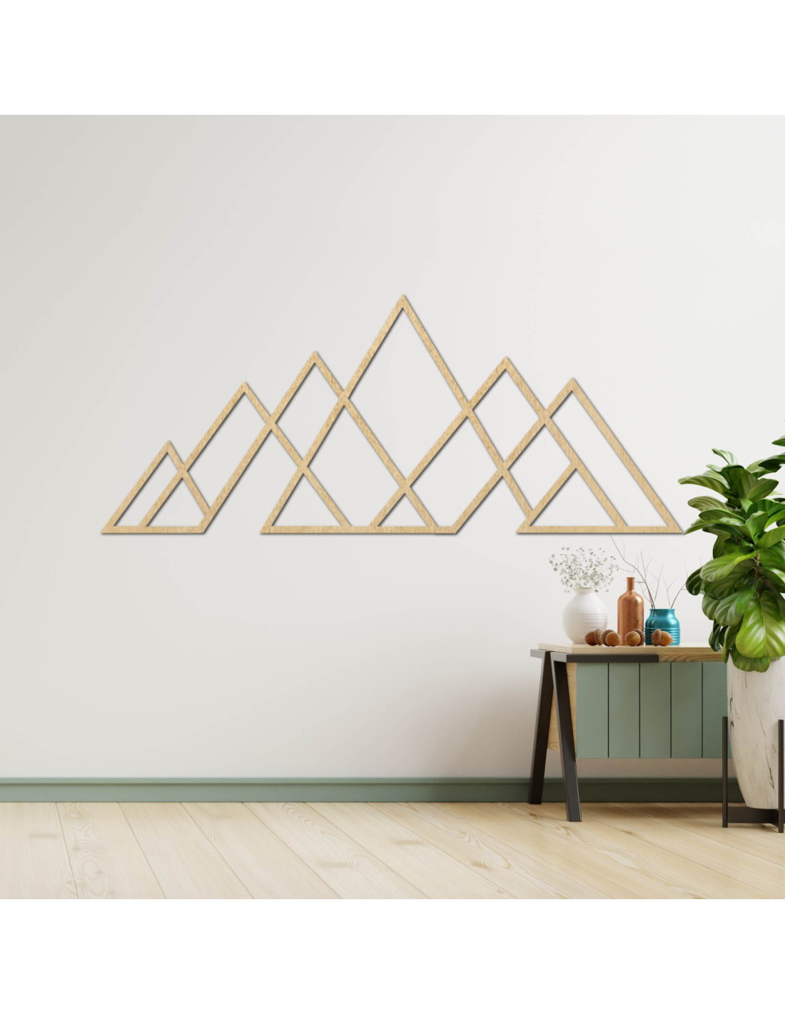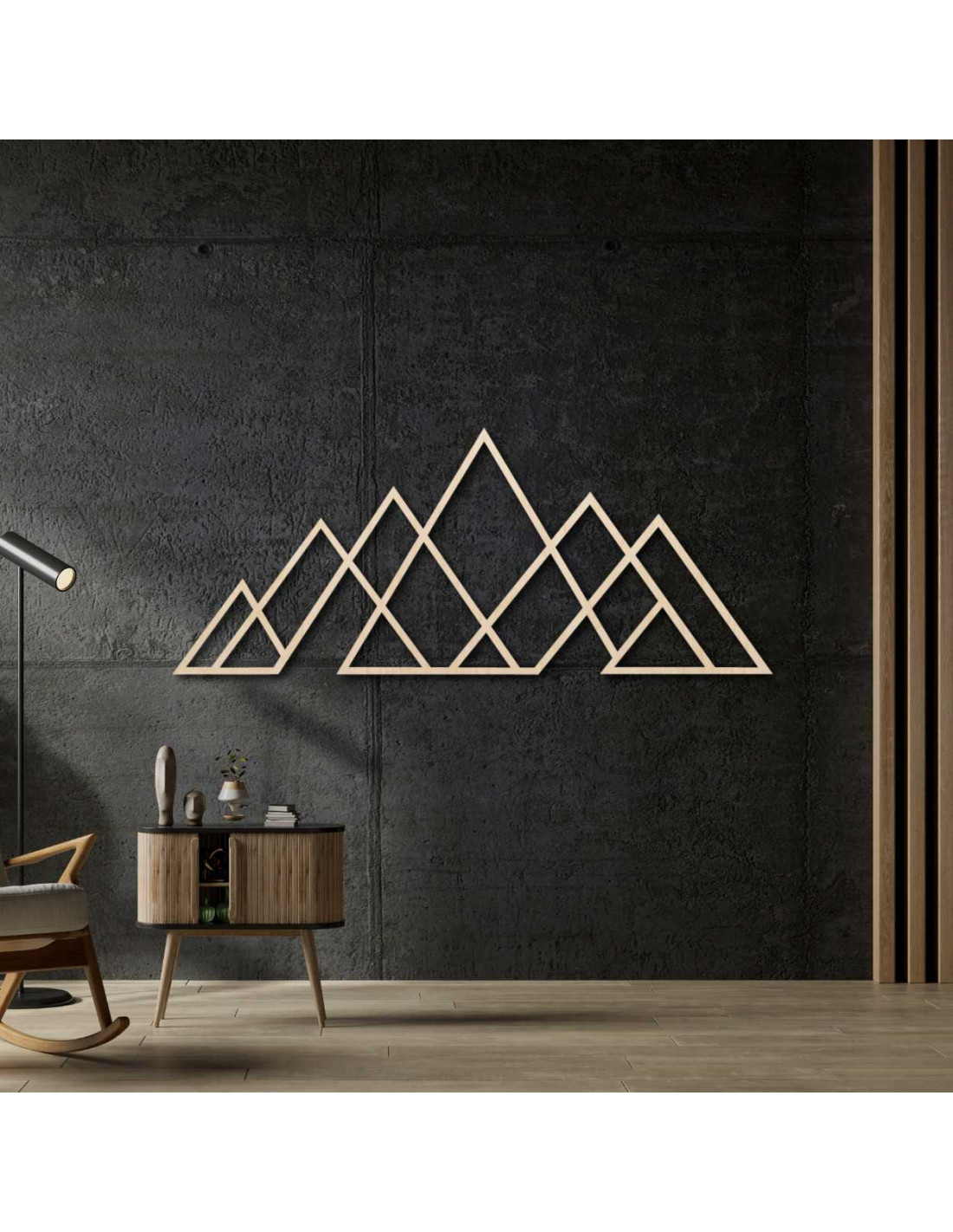 Geometrický obraz hor – dřevěná nástěnná dekorace v moderním stylu pro milovníky přírody a minimalismu.