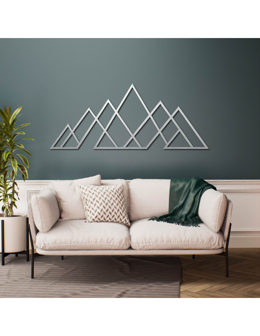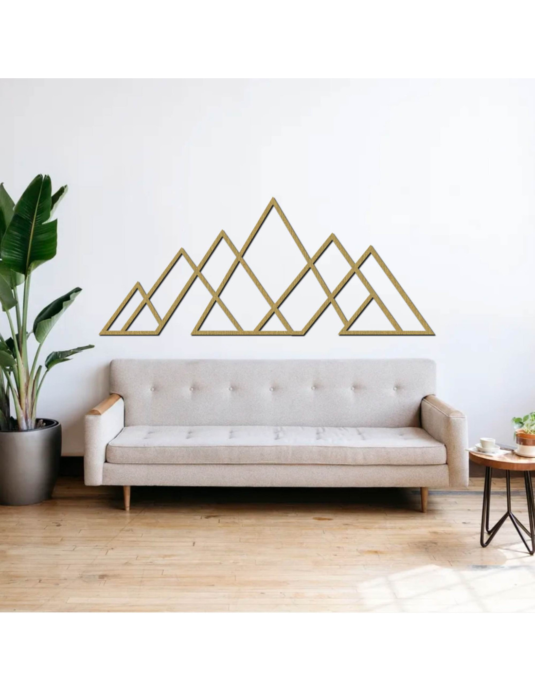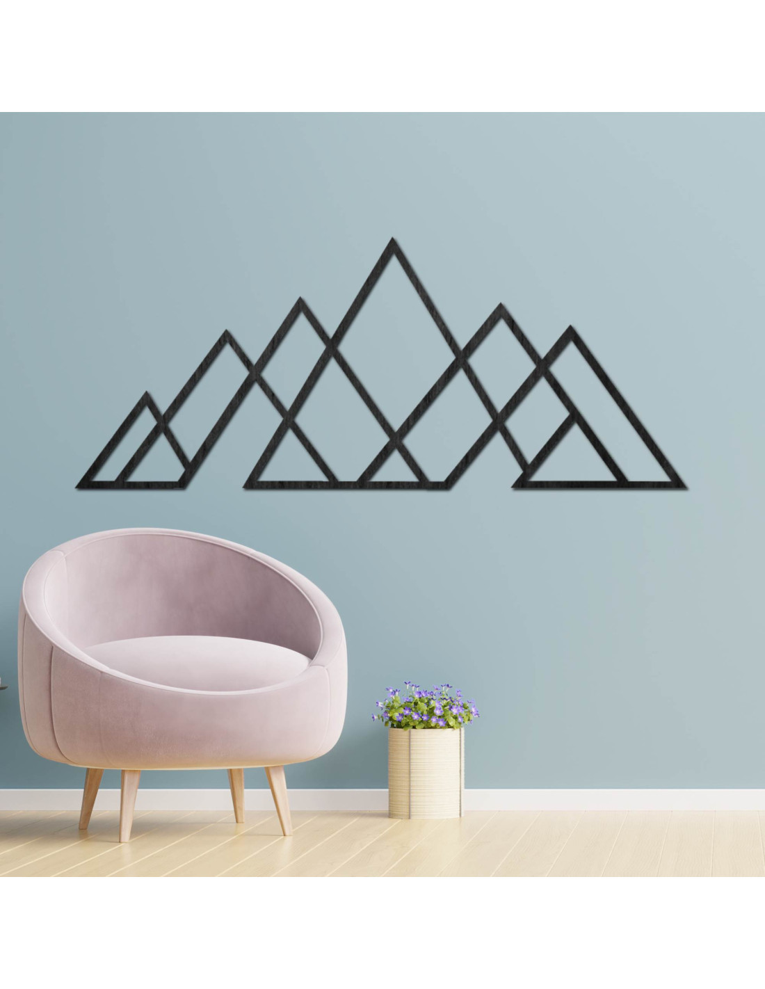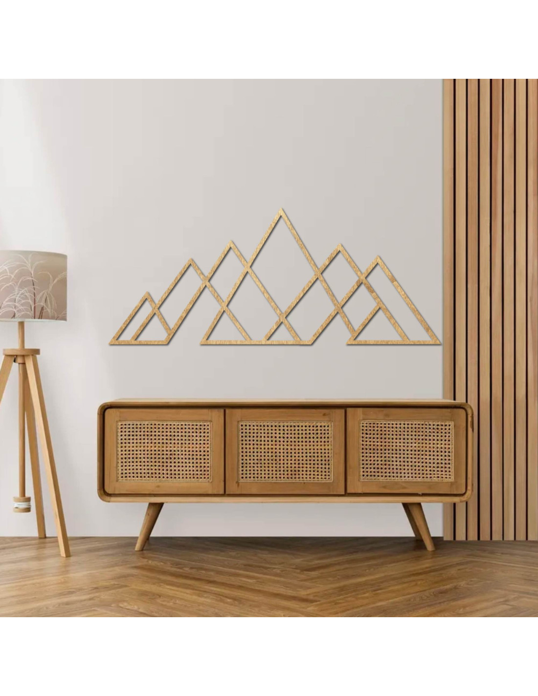 Geometrický obraz hor – dřevěná nástěnná dekorace v moderním stylu pro milovníky přírody a minimalismu.