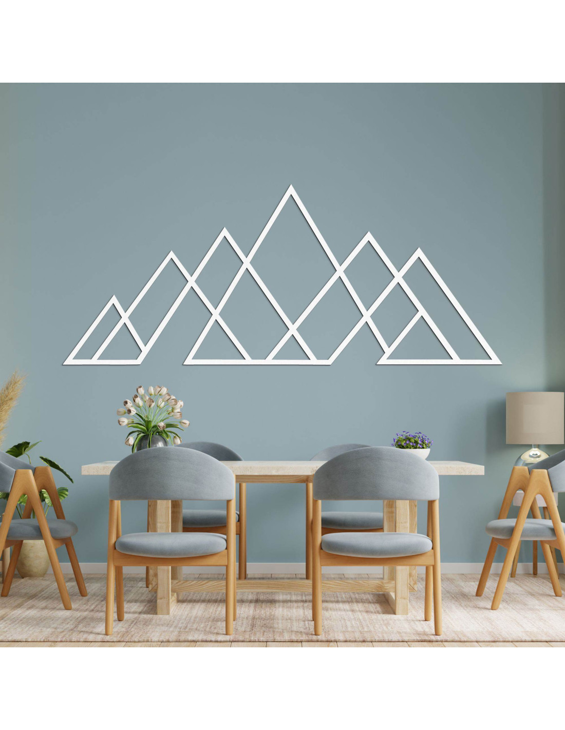 Geometrický obraz hor – dřevěná nástěnná dekorace v moderním stylu pro milovníky přírody a minimalismu.