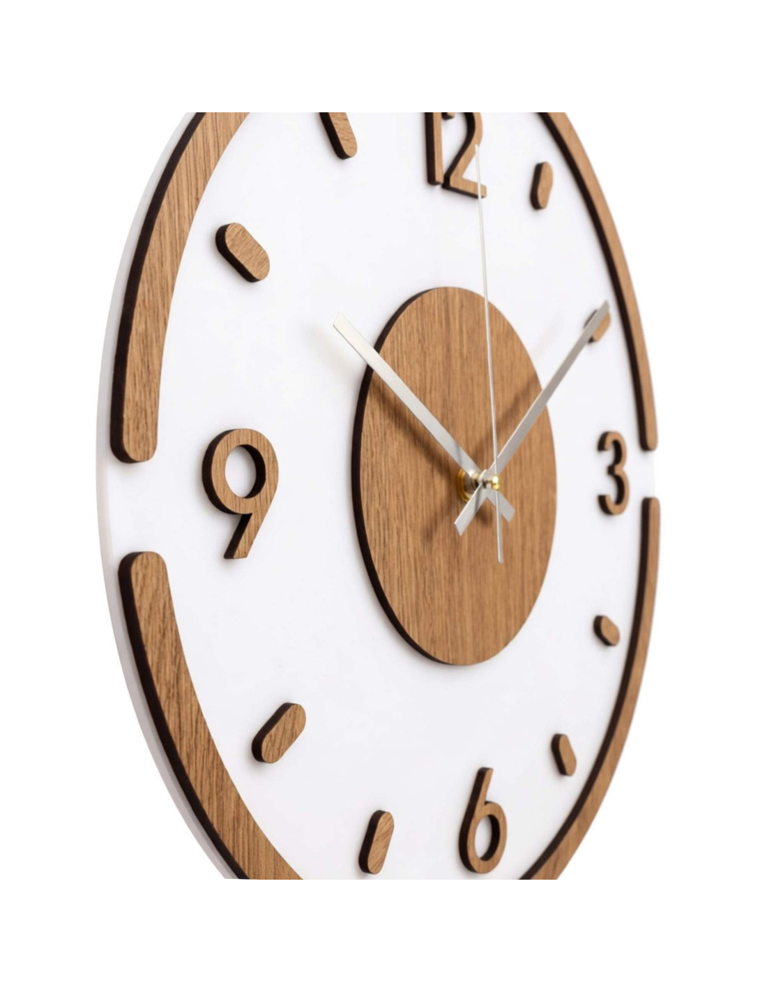 Hodiny jsou vyrobeny z kvalitní HDF desky s dubovým vzorem v kombinaci s lesklým a elegantním bílým plexisklem.