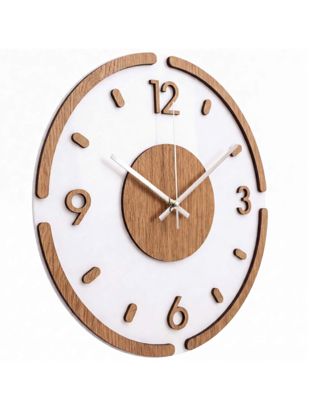 Hodiny jsou vyrobeny z kvalitní HDF desky s dubovým vzorem v kombinaci s lesklým a elegantním bílým plexisklem.