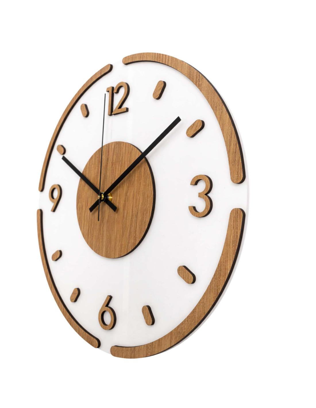 Moderní kulaté nástěnné hodiny s dubovým dekorem a bílým plexisklem .