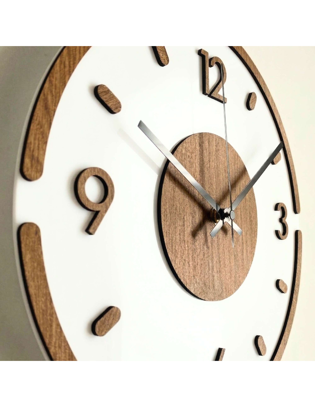 Hodiny jsou vyrobeny z kvalitní HDF desky s dubovým vzorem v kombinaci s lesklým a elegantním bílým plexisklem.