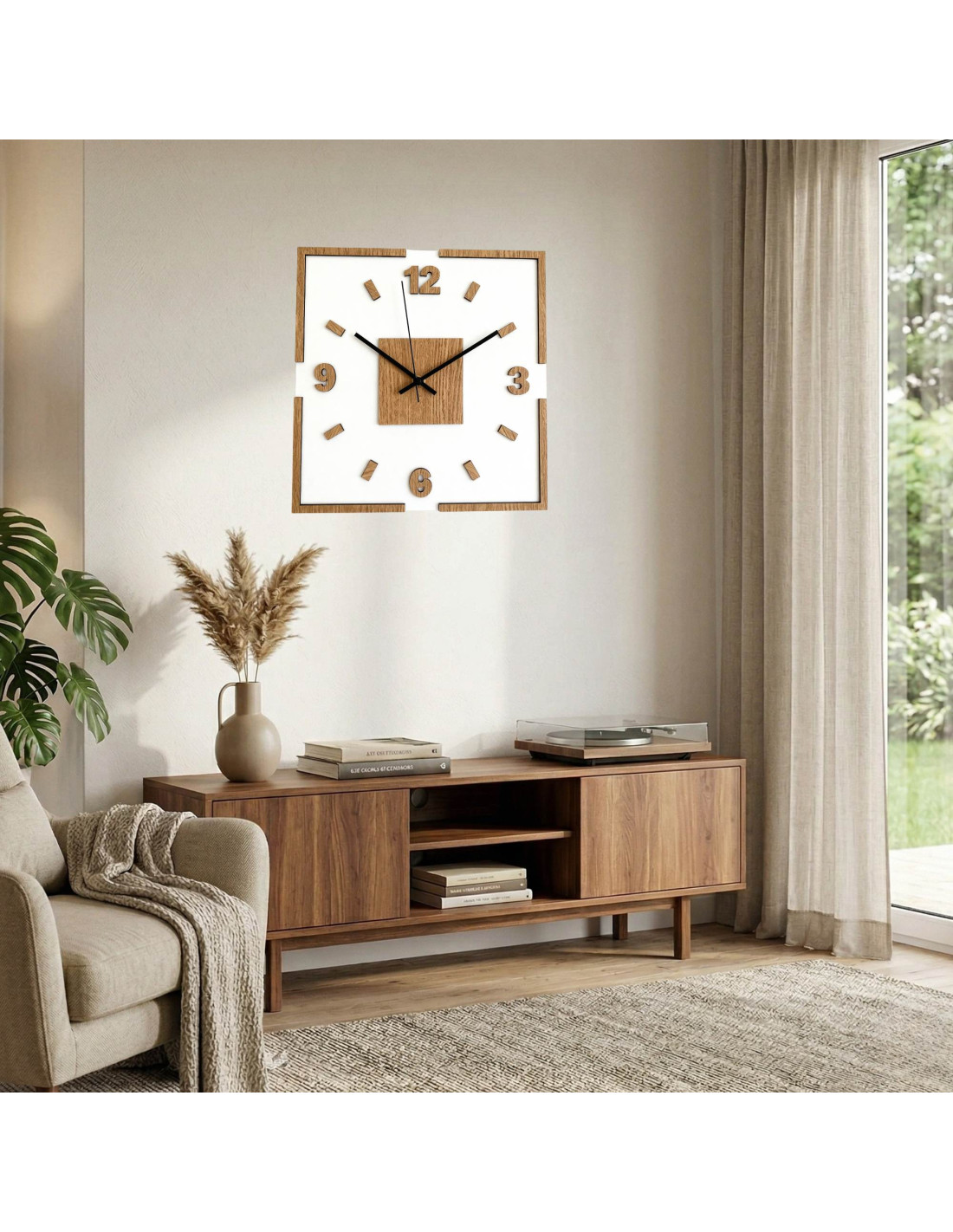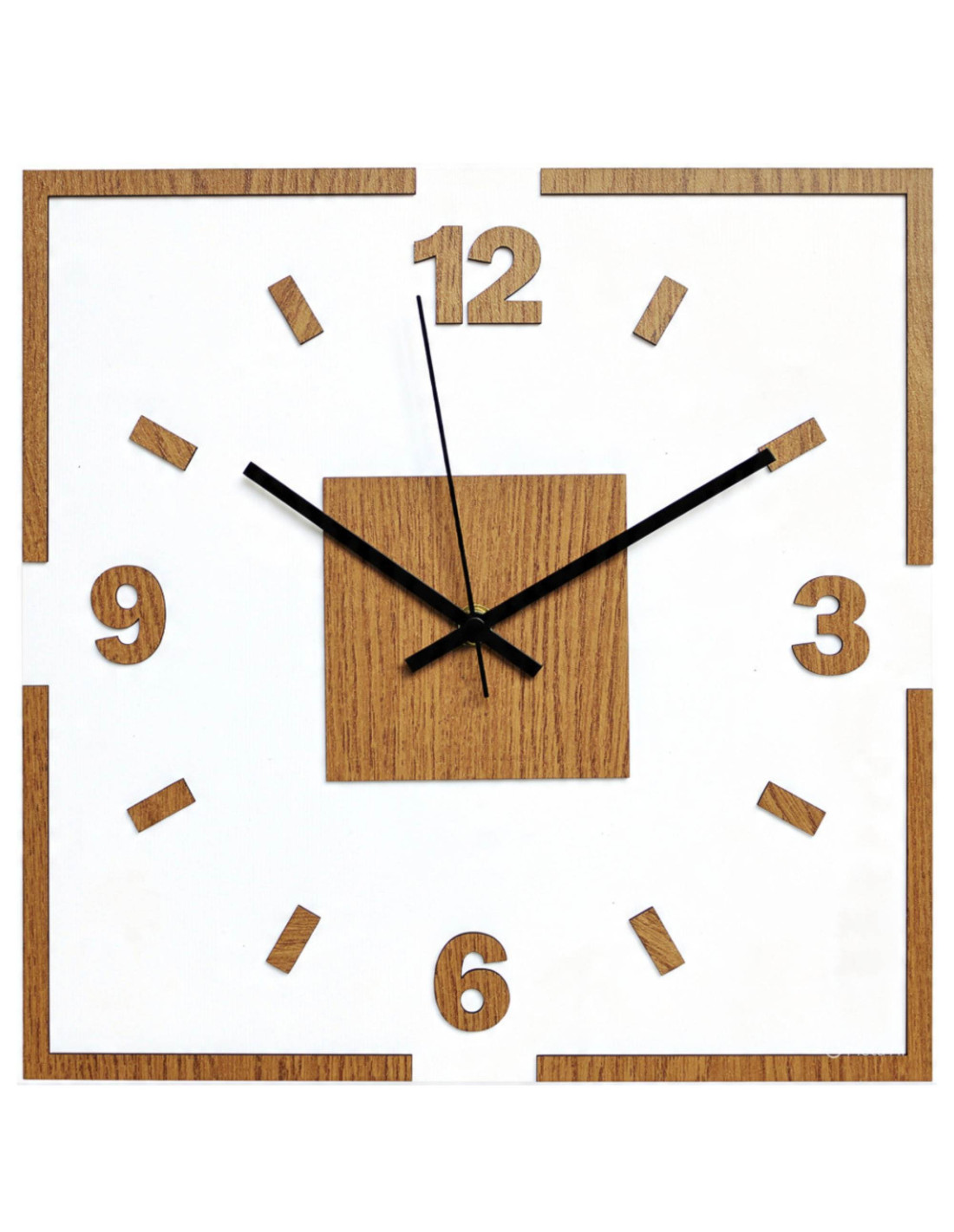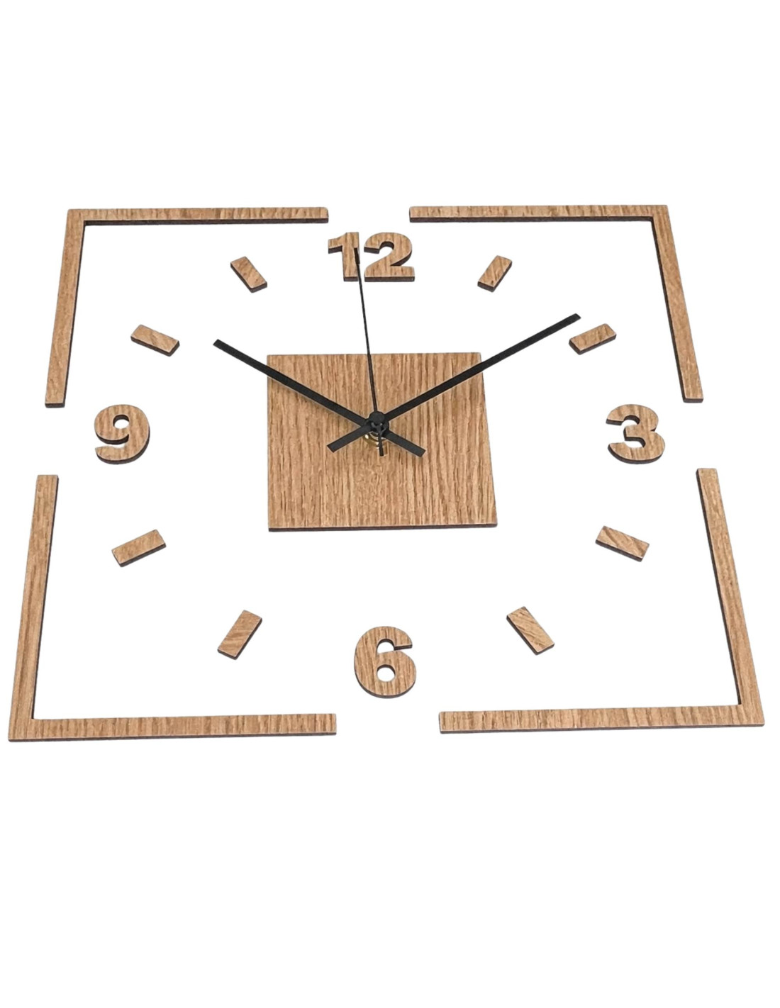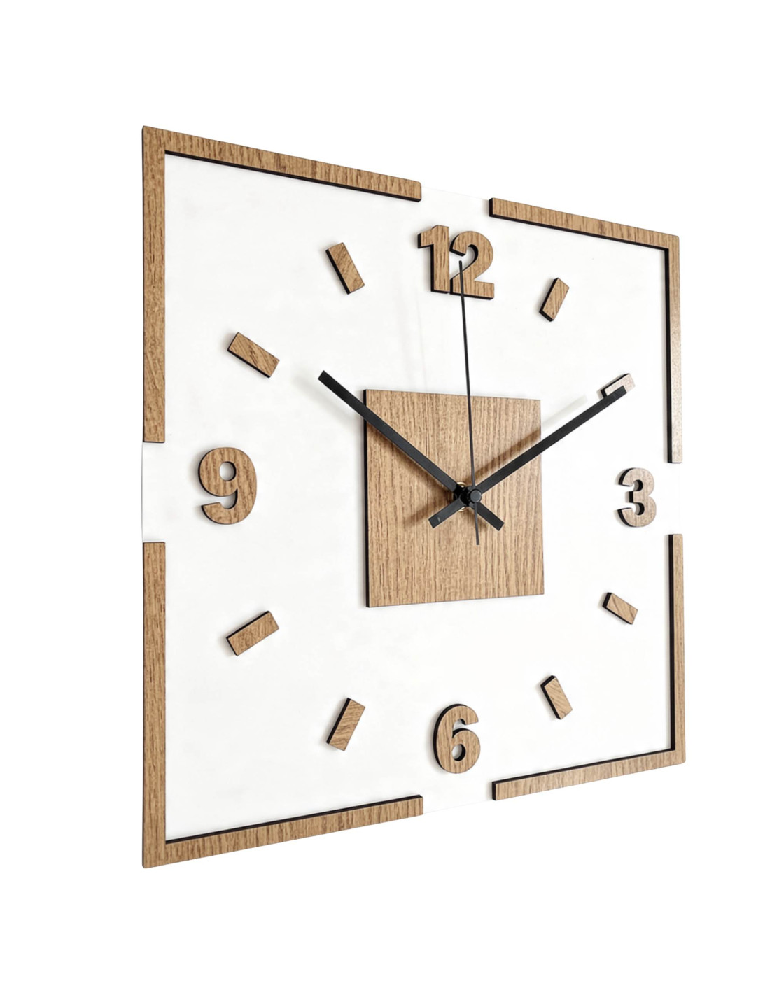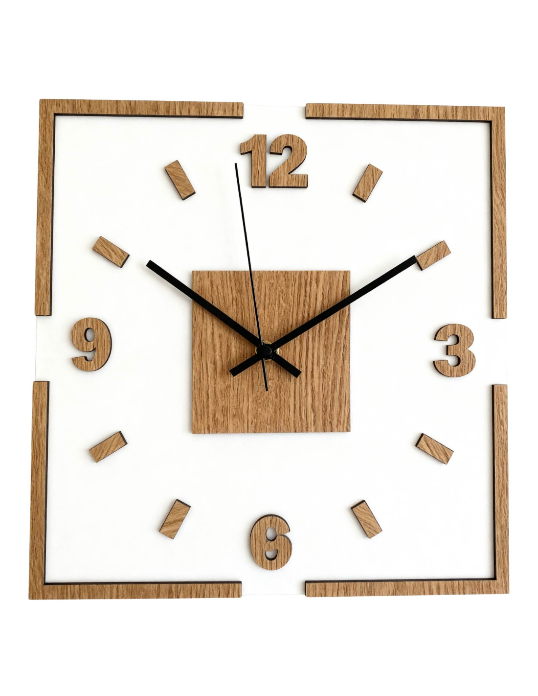 Moderní čtvercové nástěnné hodiny s dubovým dekorem a bílým podkladem