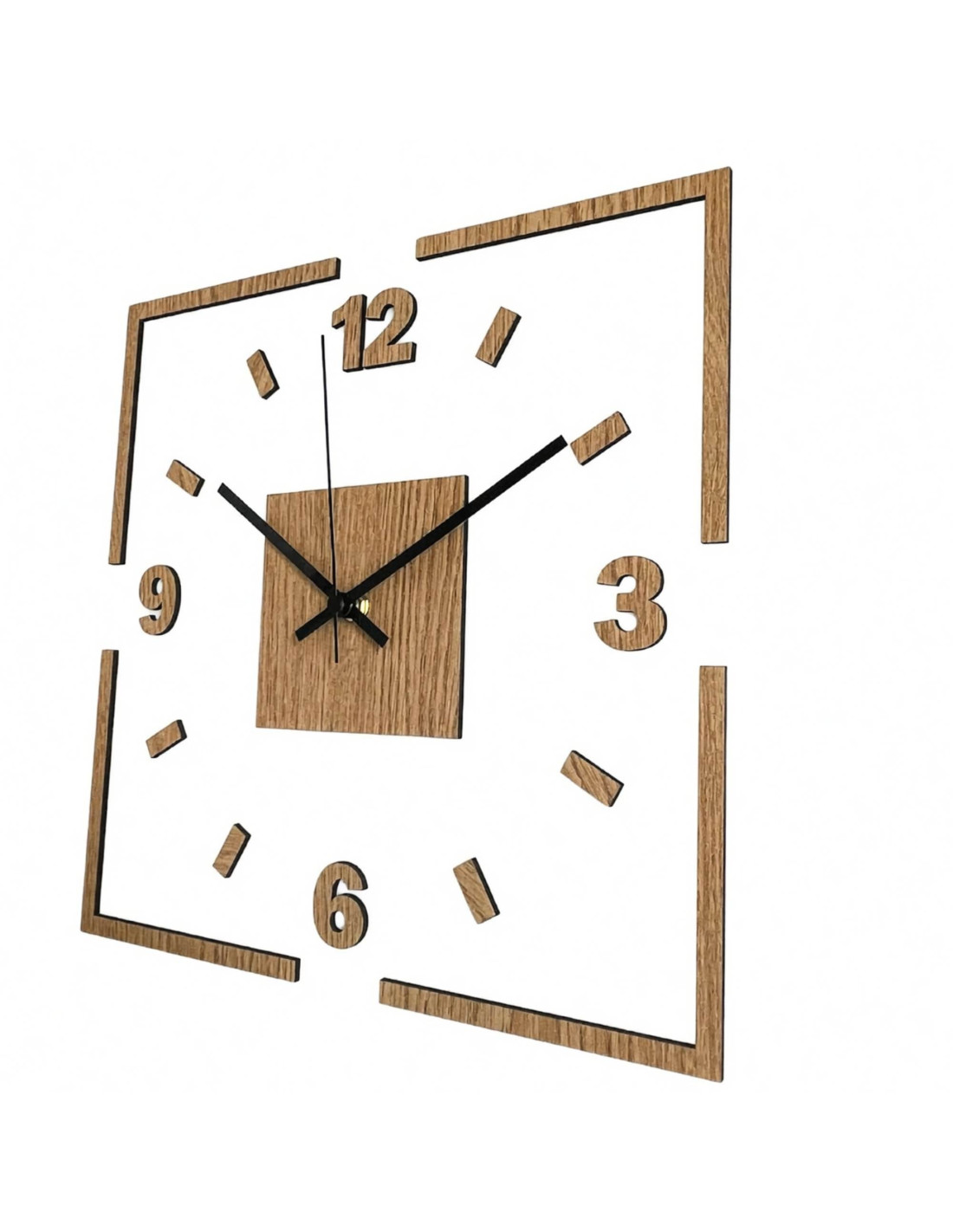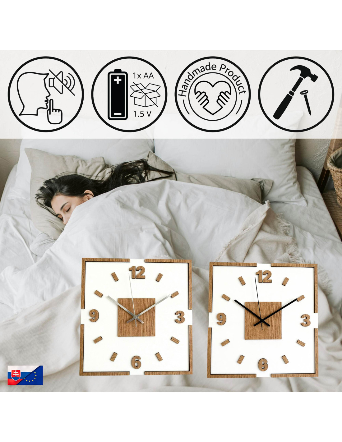 Střed hodin zvýrazňuje dubový čtverec, ze kterého vycházejí černé nebo stříbrné ručičky pro dokonalý kontrast a čitelnost.