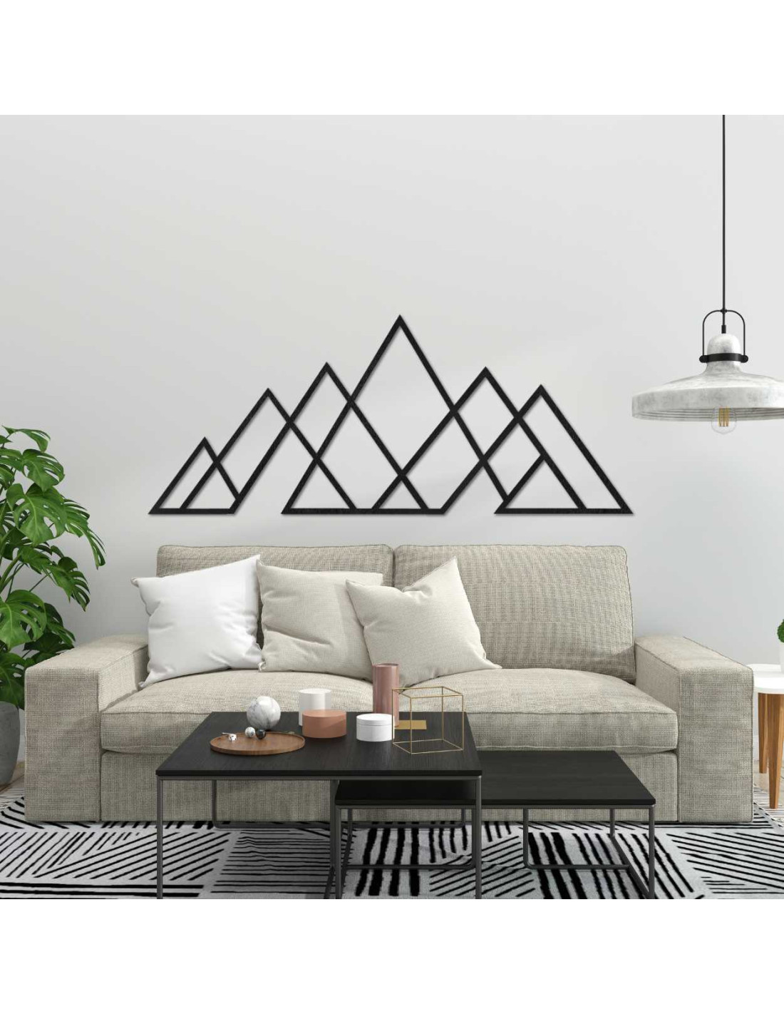 Moderní nástěnná dekorace s motivem hor v minimalistickém geometrickém stylu .
