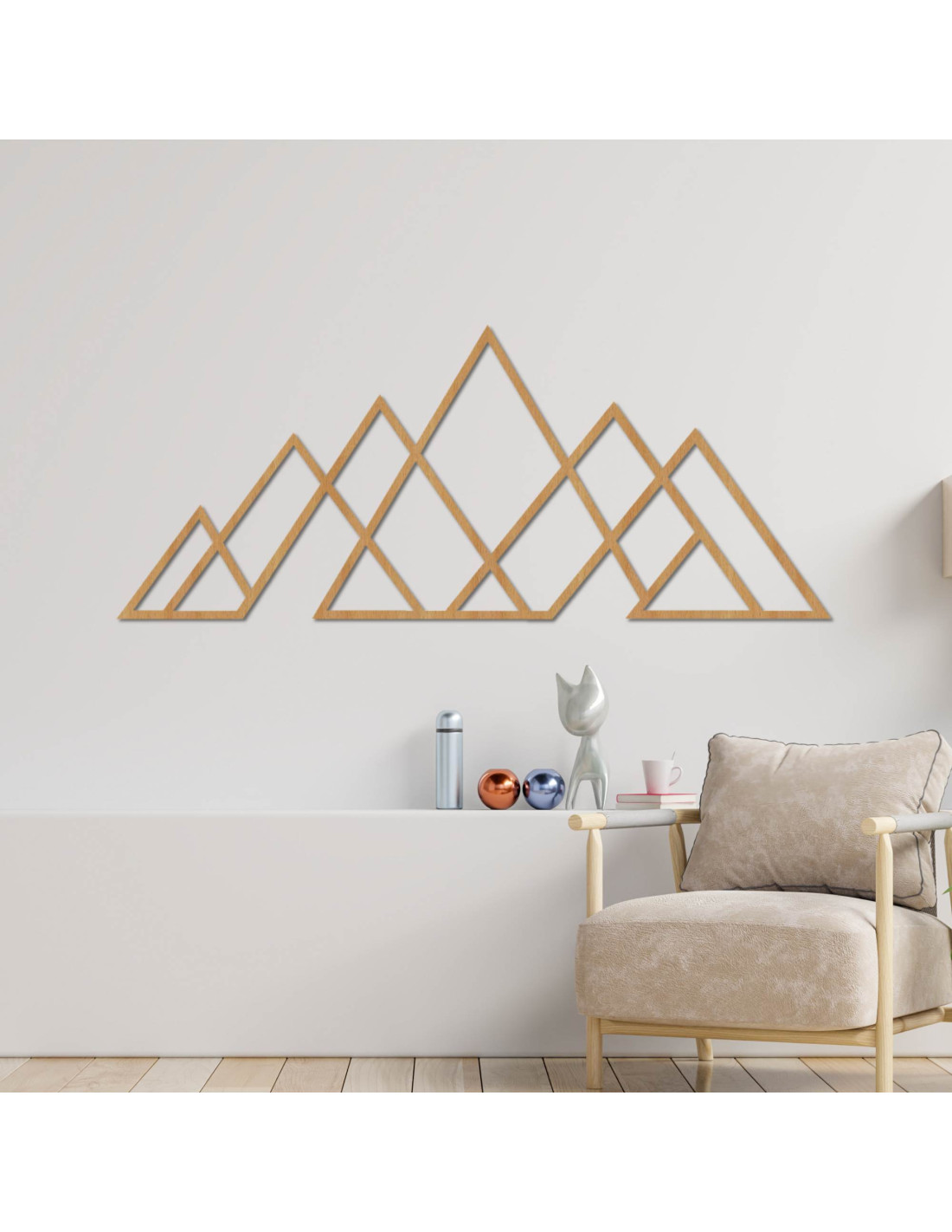 Moderní nástěnná dekorace s motivem hor v minimalistickém geometrickém stylu .