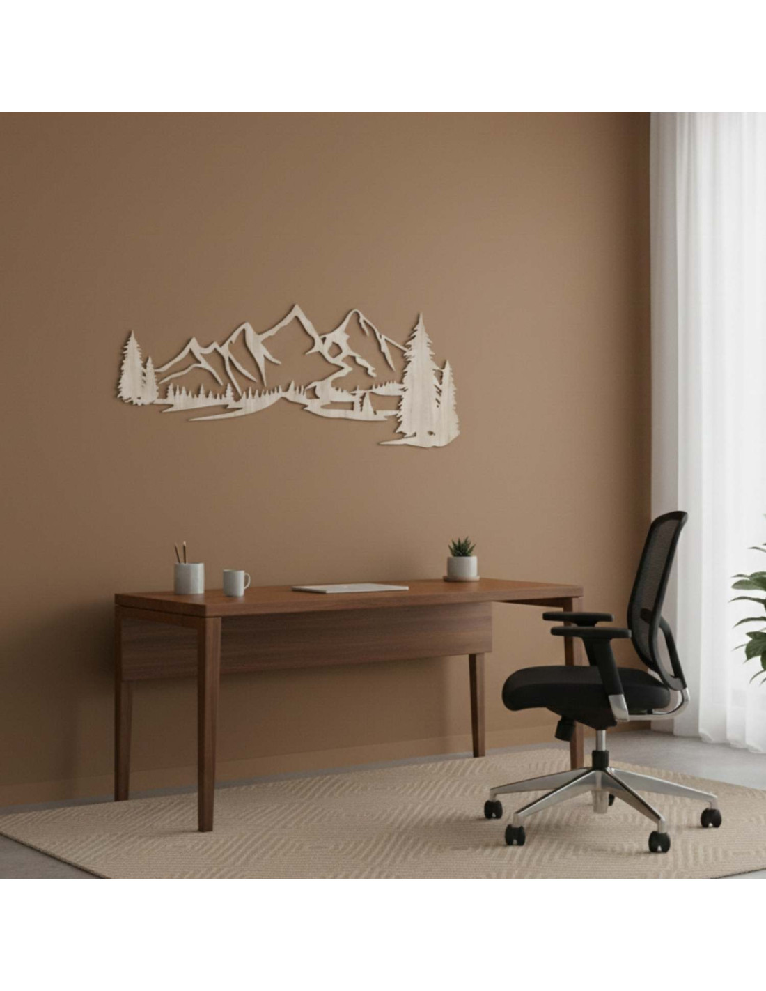 hnědý obraz ořech, Nástěnná dřevěná dekorace – silueta hor a stromů v lese