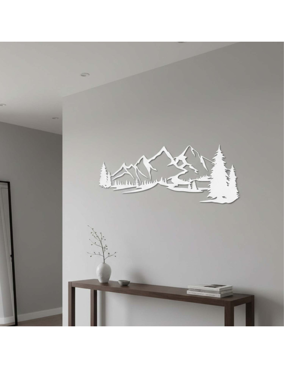 dřevěná dekorace bílá, Moderní dřevěný obraz Hory a les na ozdobení obývacího pokoje