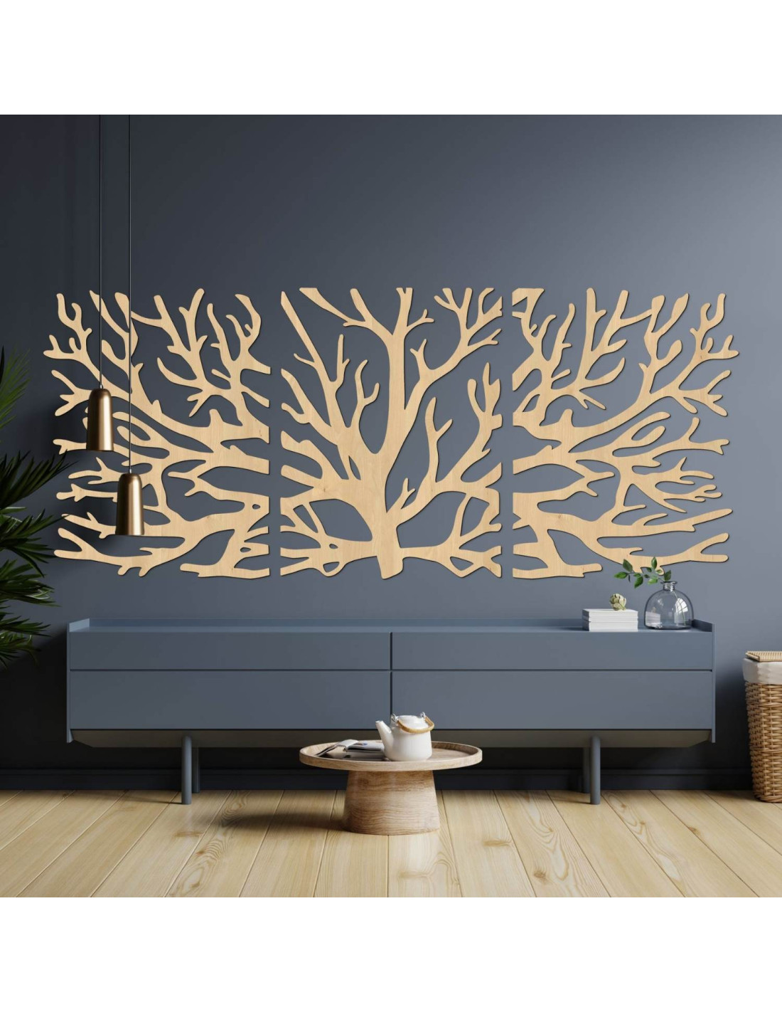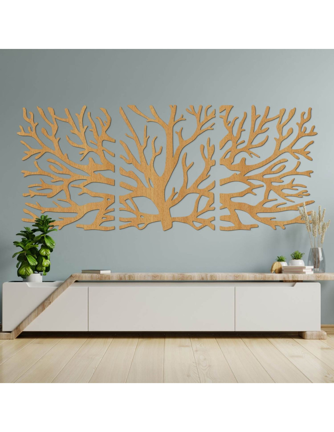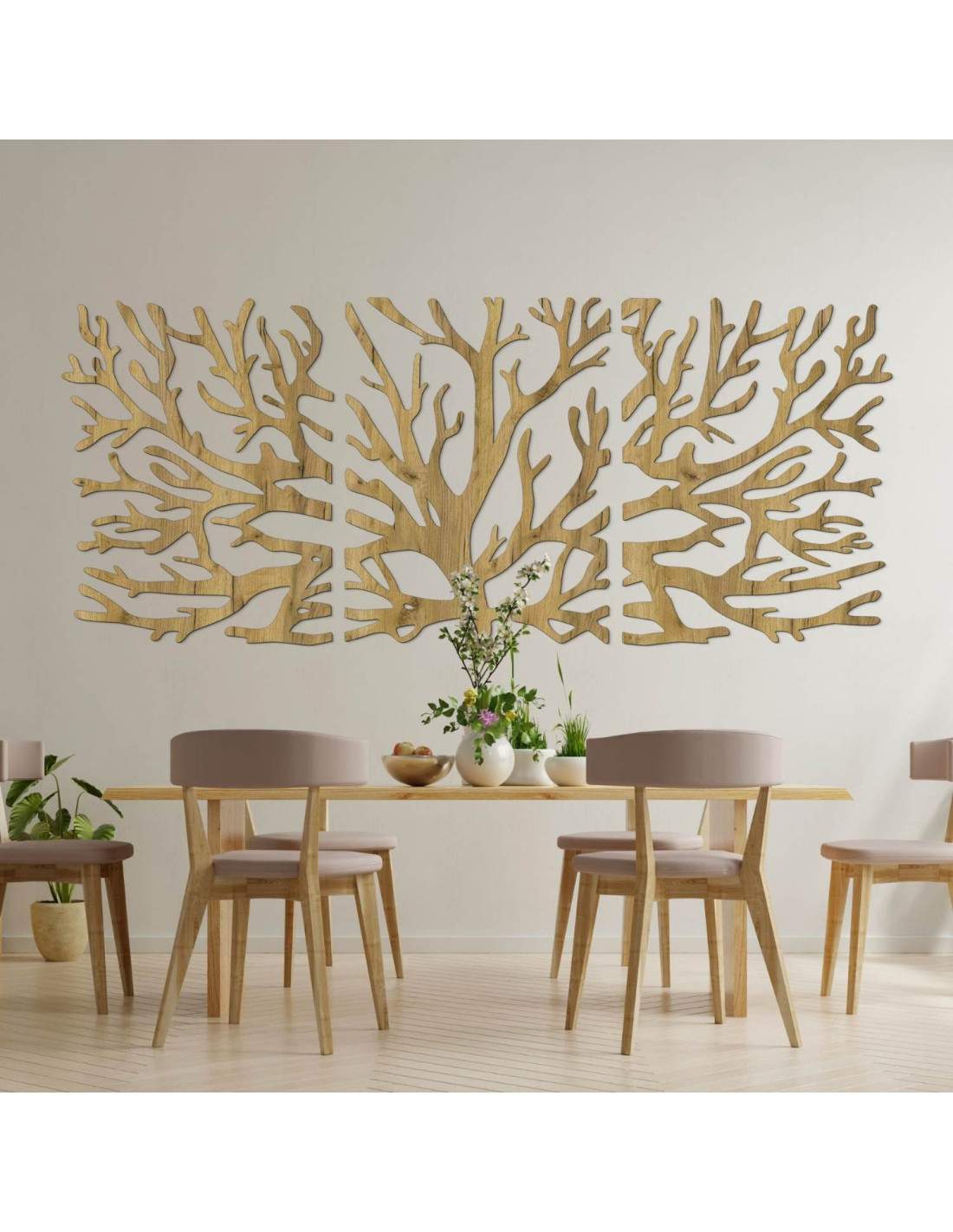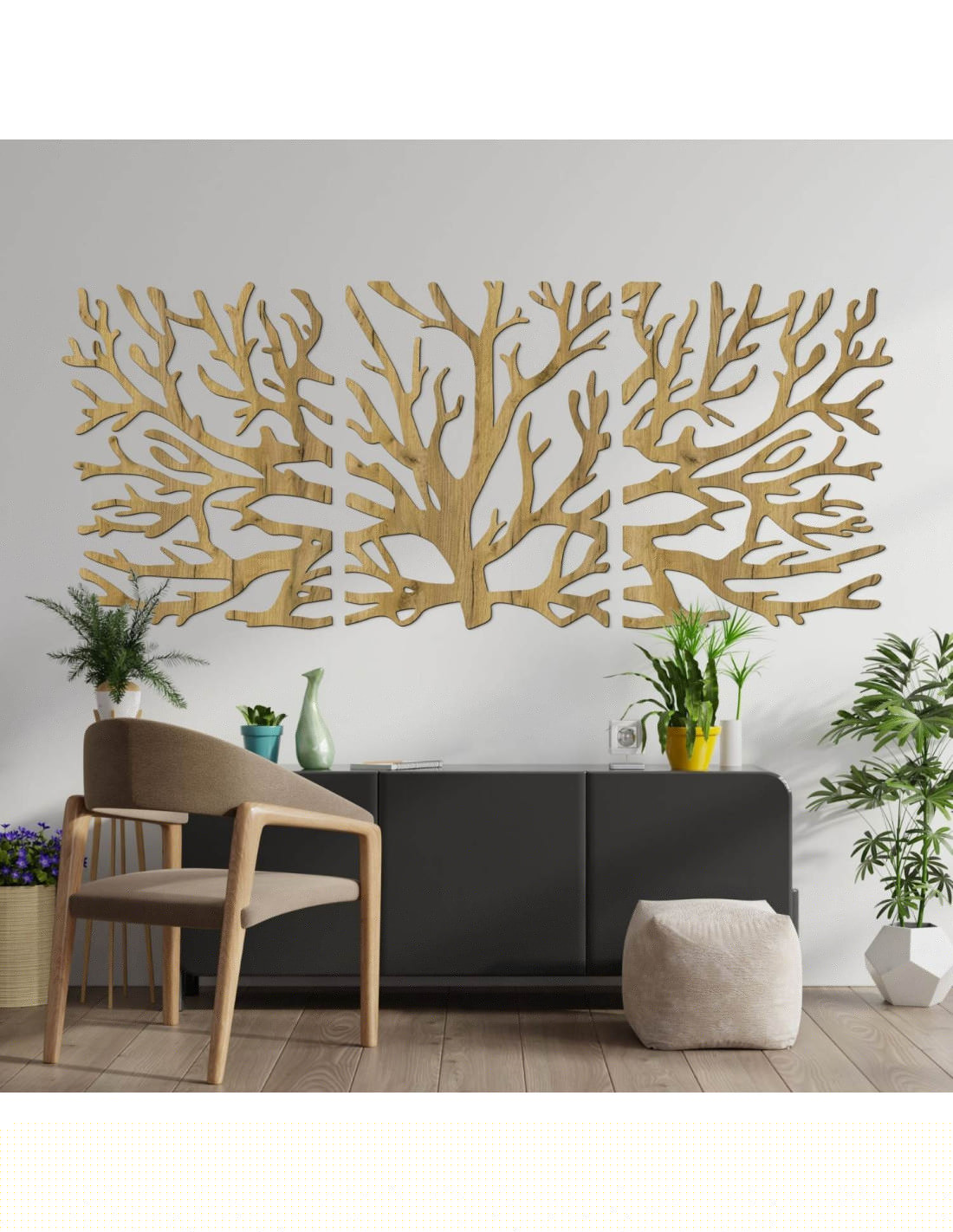 Objevte trojdílný dřevěný obraz s motivem stromu života – harmonické spojení moderního designu , přírodní symboliky a umělecké elegance , které dodá vašemu interiéru jedinečný charakter.
