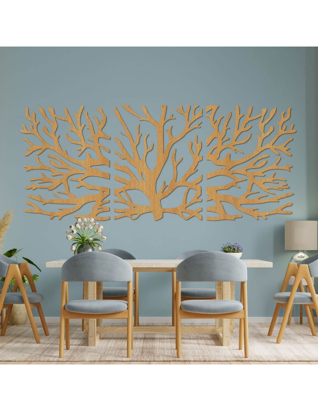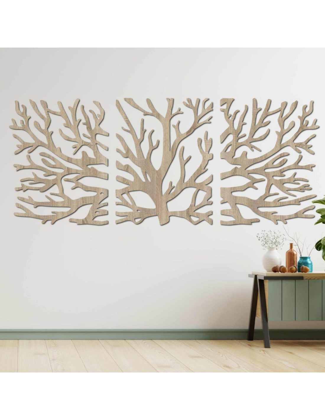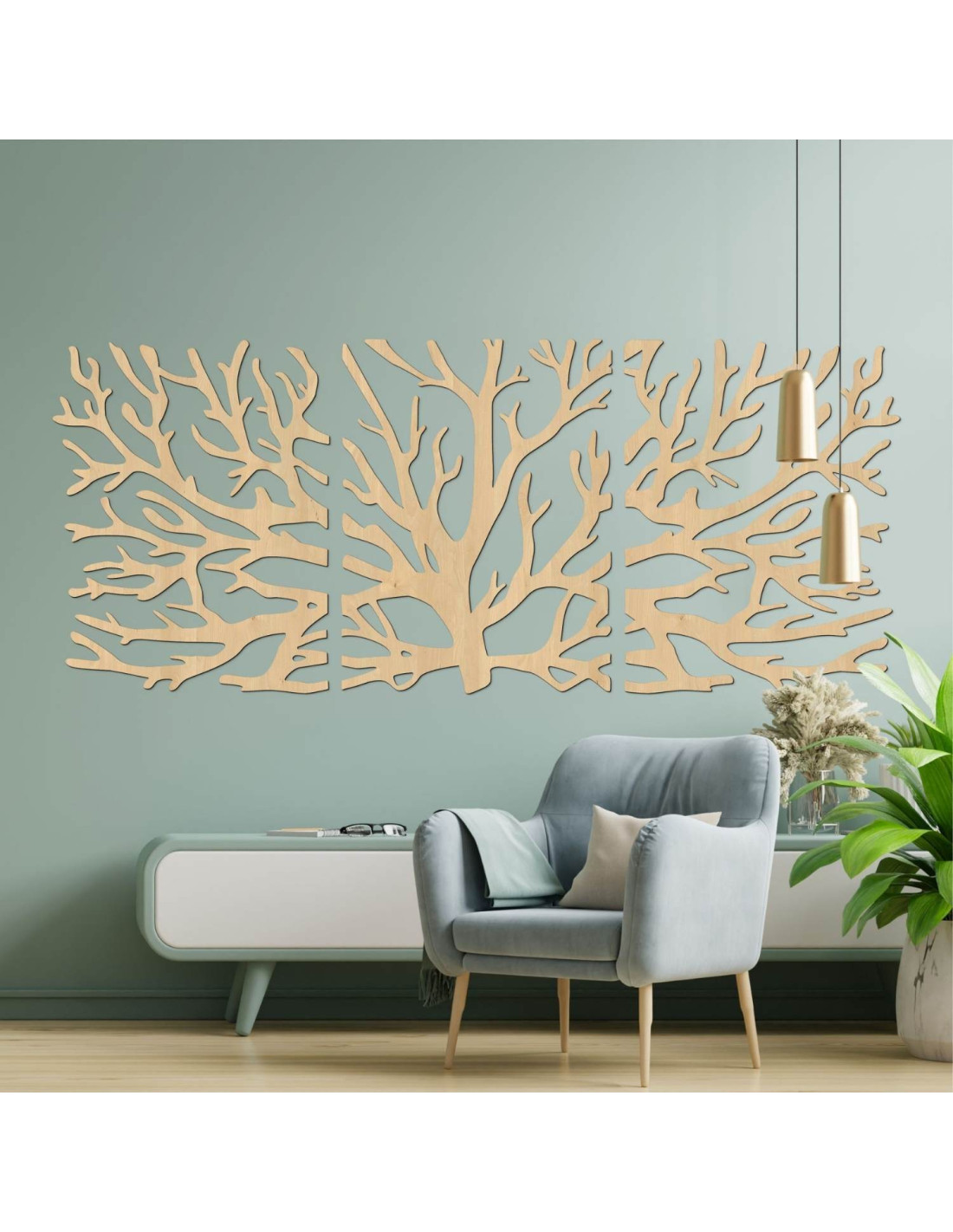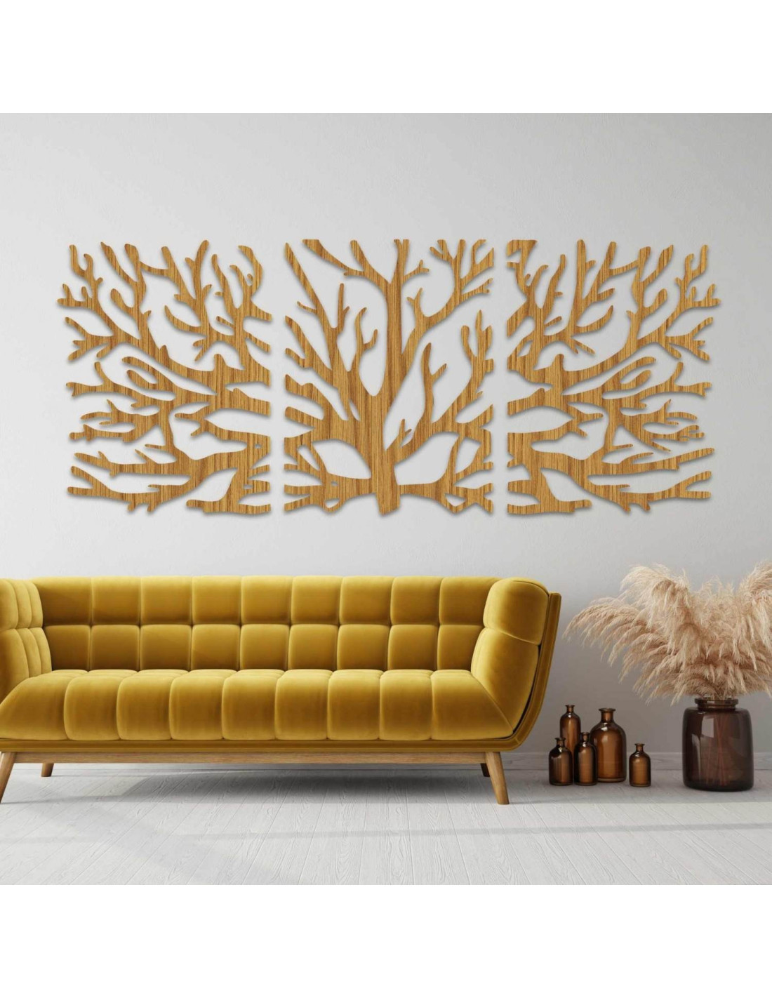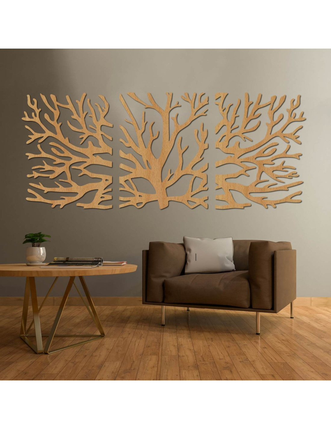 Objevte trojdílný dřevěný obraz s motivem stromu života – harmonické spojení moderního designu , přírodní symboliky a umělecké elegance , které dodá vašemu interiéru jedinečný charakter.