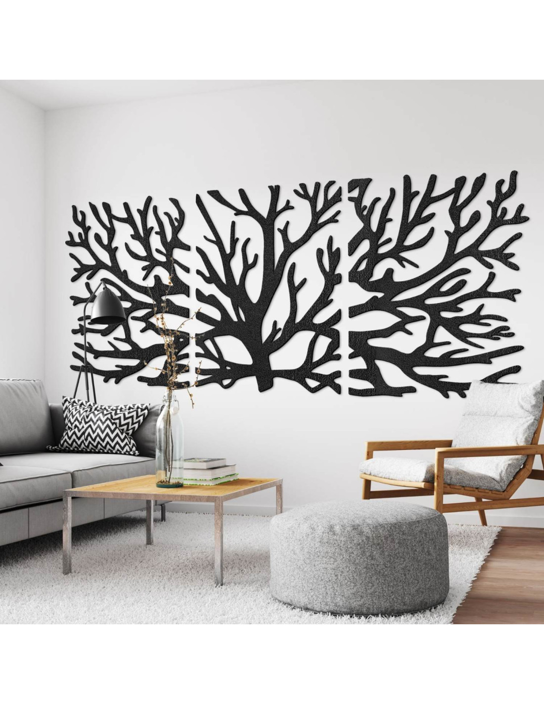 Třídílný dřevěný obraz Strom života v tmavém provedení na stěně moderního interiéru