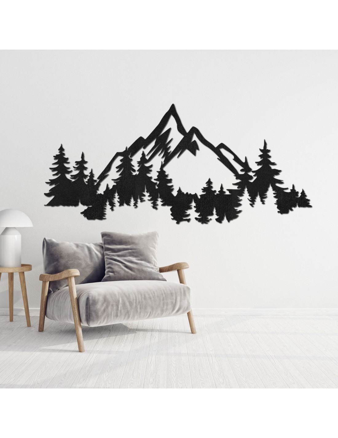 Minimalistický 3D obraz hory a les z černé HDF desky nad sedačkou