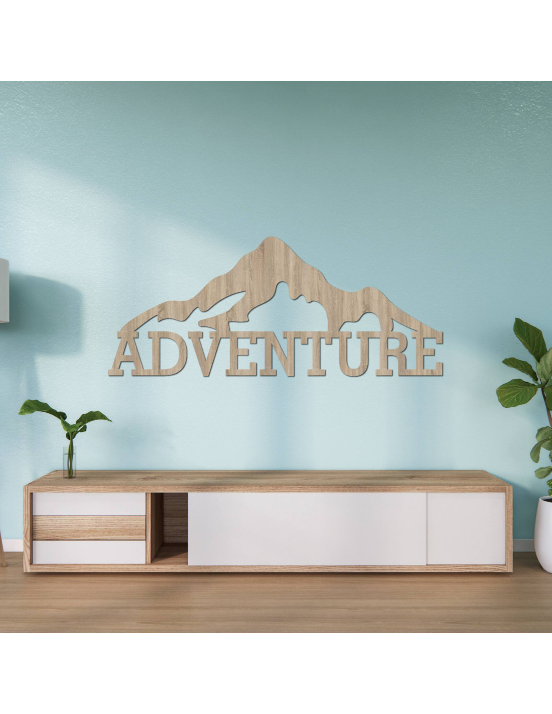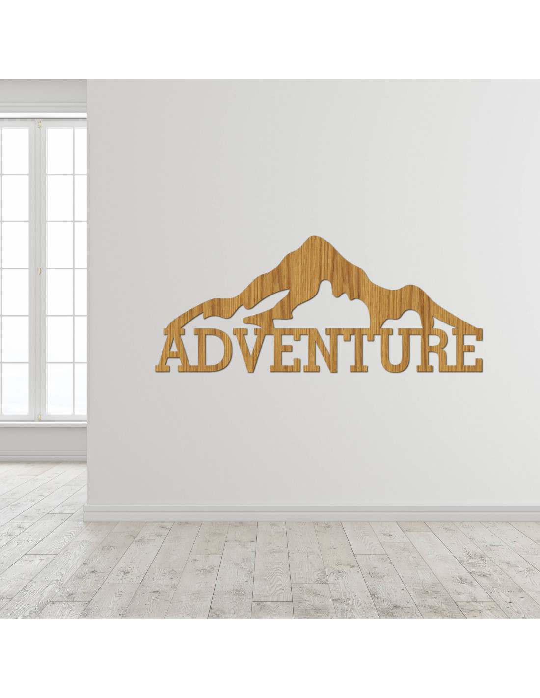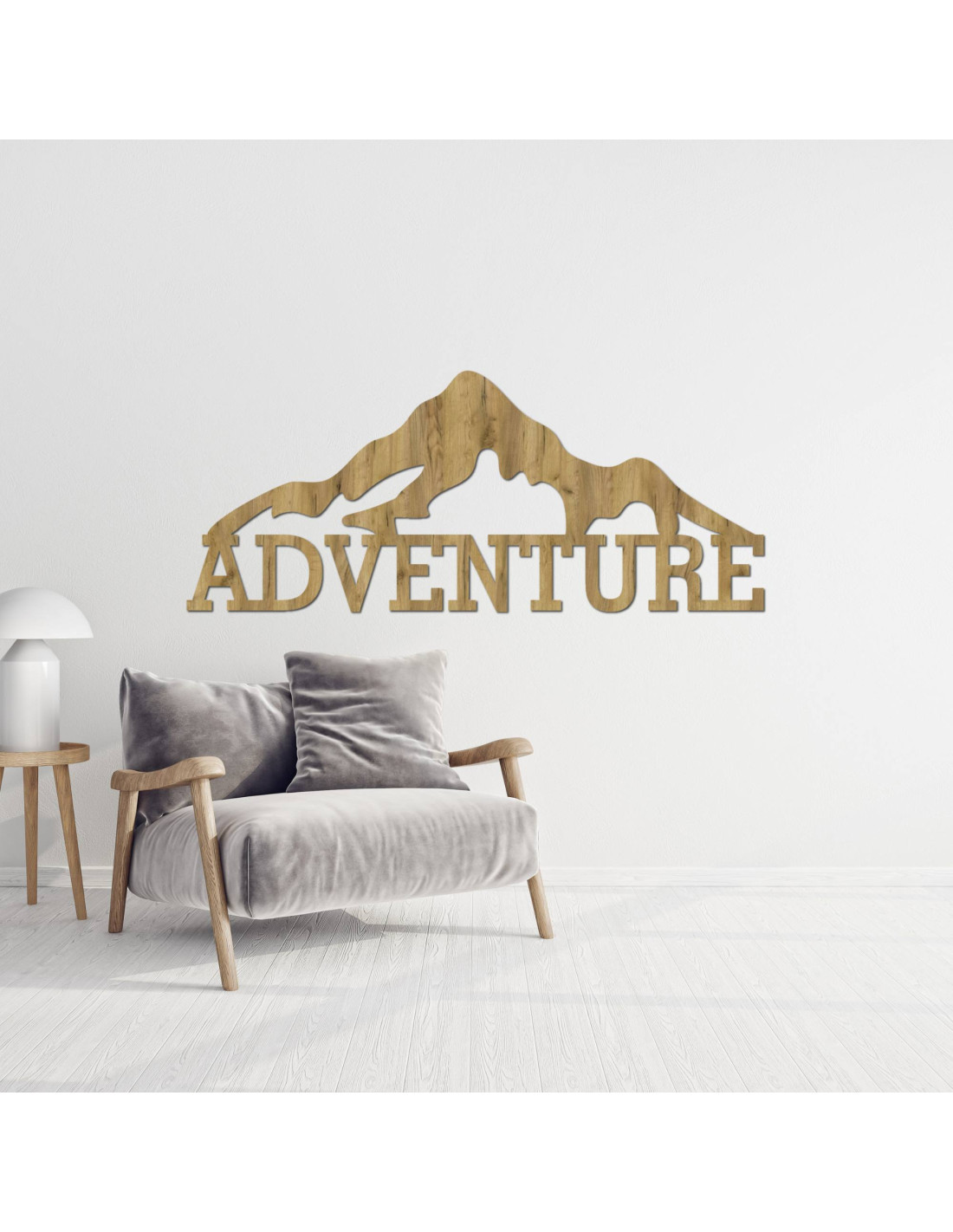 Vyřezávaný dřevěný obraz na stěně hory - ADVENTURE