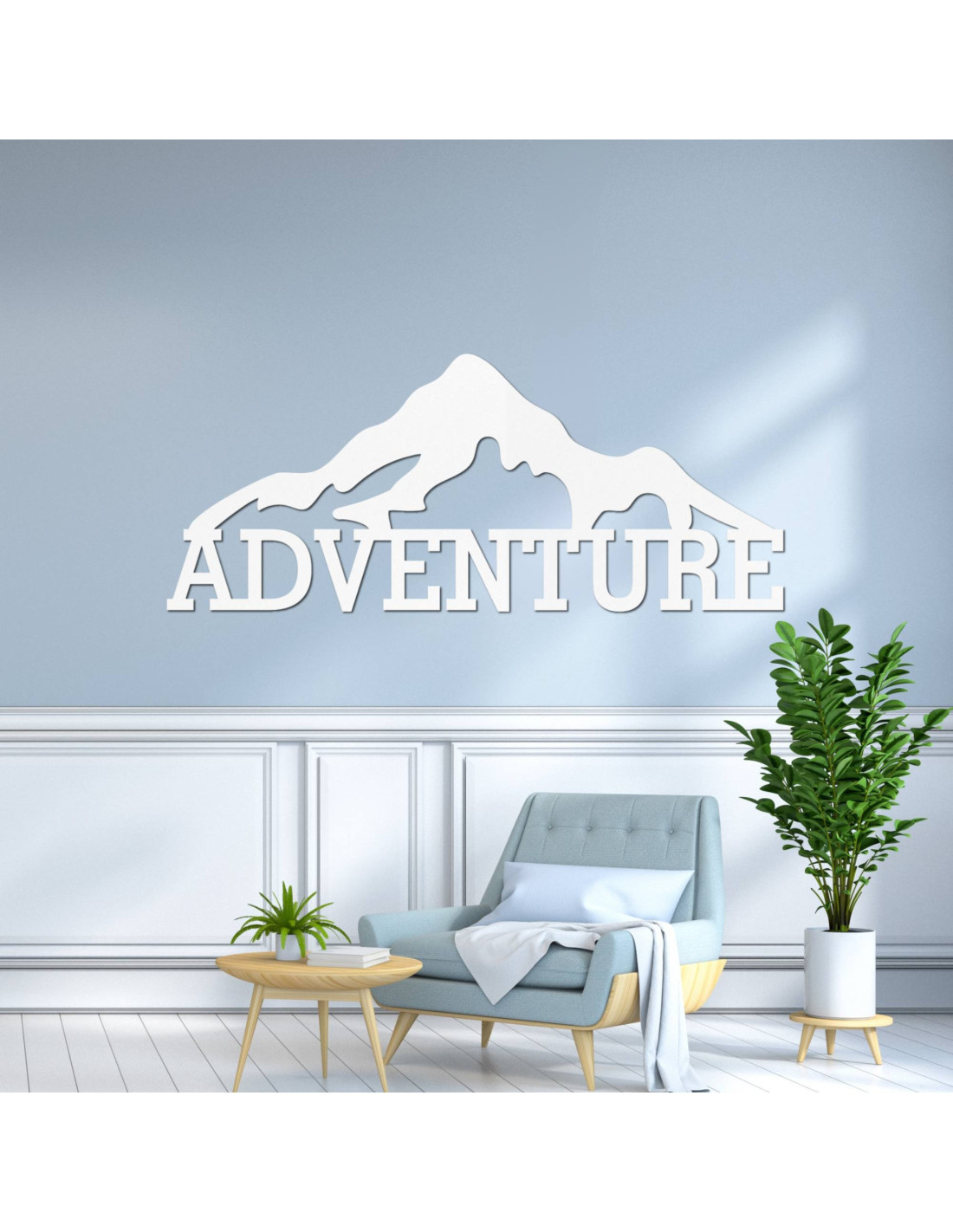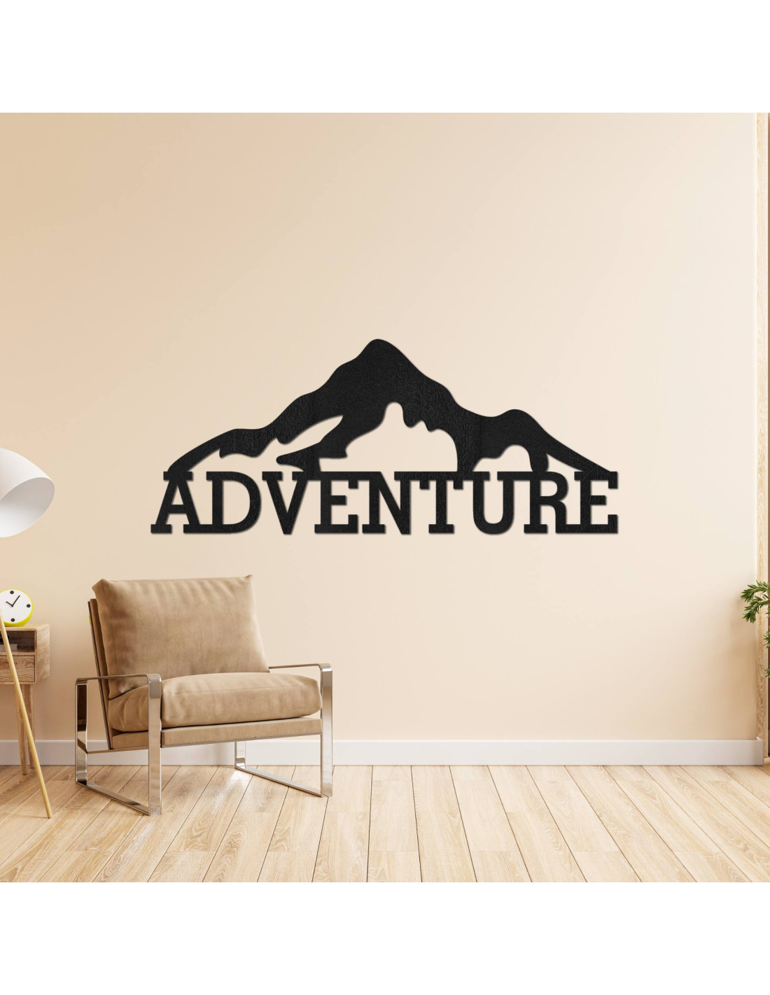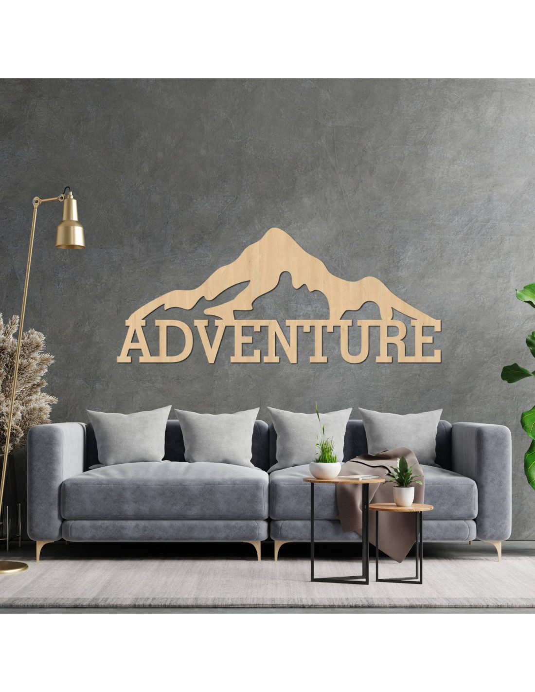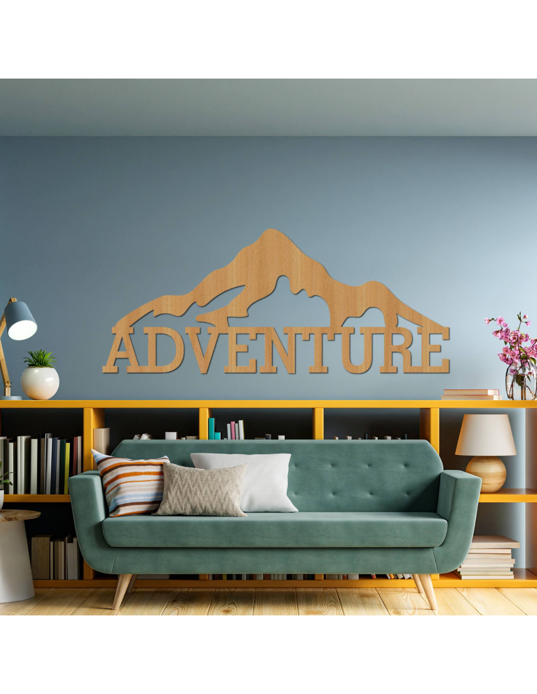Vyřezávaný dřevěný obraz na stěně hory - ADVENTURE
