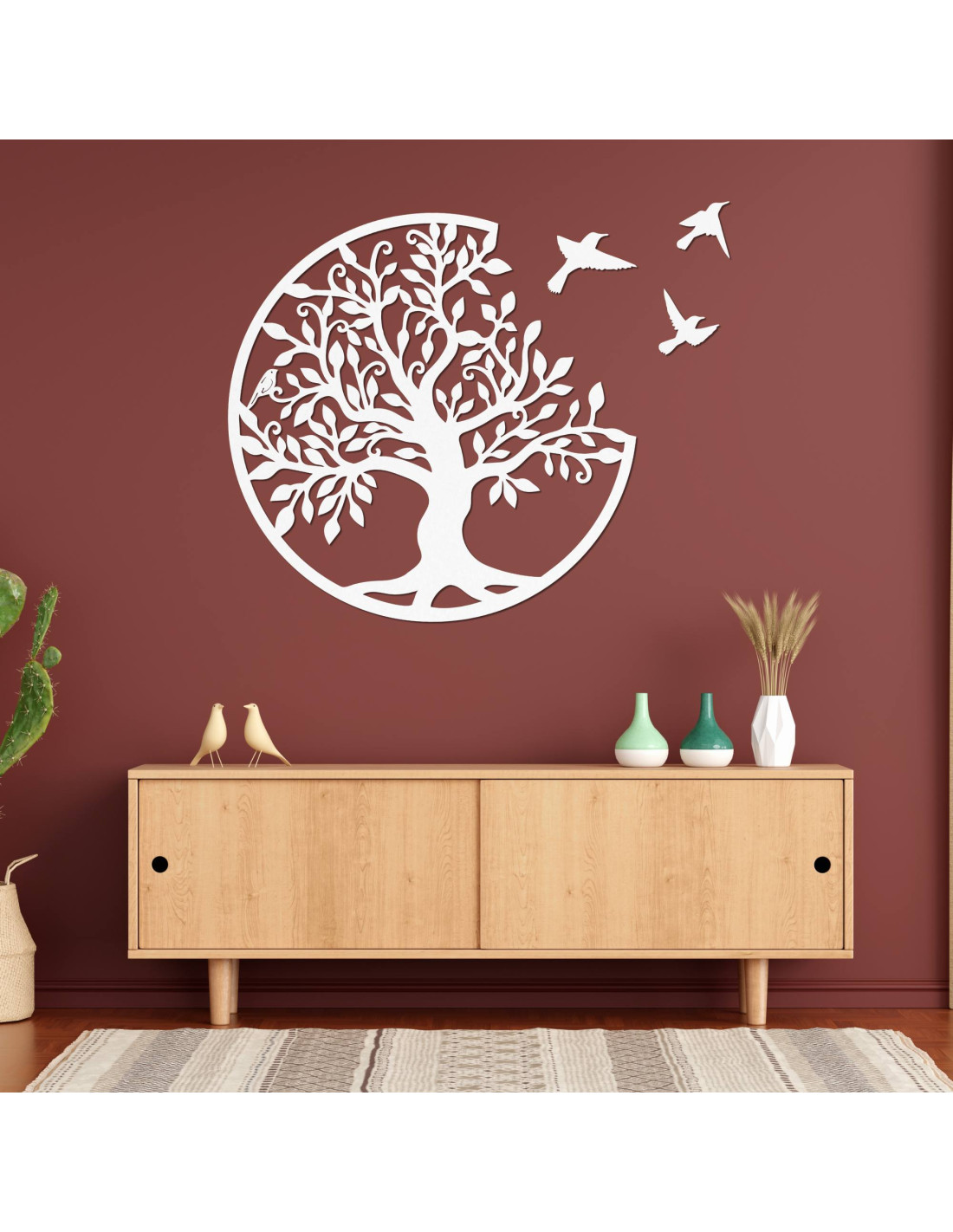Strom života je symbolem růstu, síly a nepřetržitého cyklu života. Jeho hluboké kořeny představují pevné spojení s tradicemi, předky a naší minulostí. Rozvětvená koruna stromu směřující k nebi symbolizuje osobní rozvoj, duchovní růst a touhu po dosahování nových cílů a výšin. - 🕊️ Ptáci :