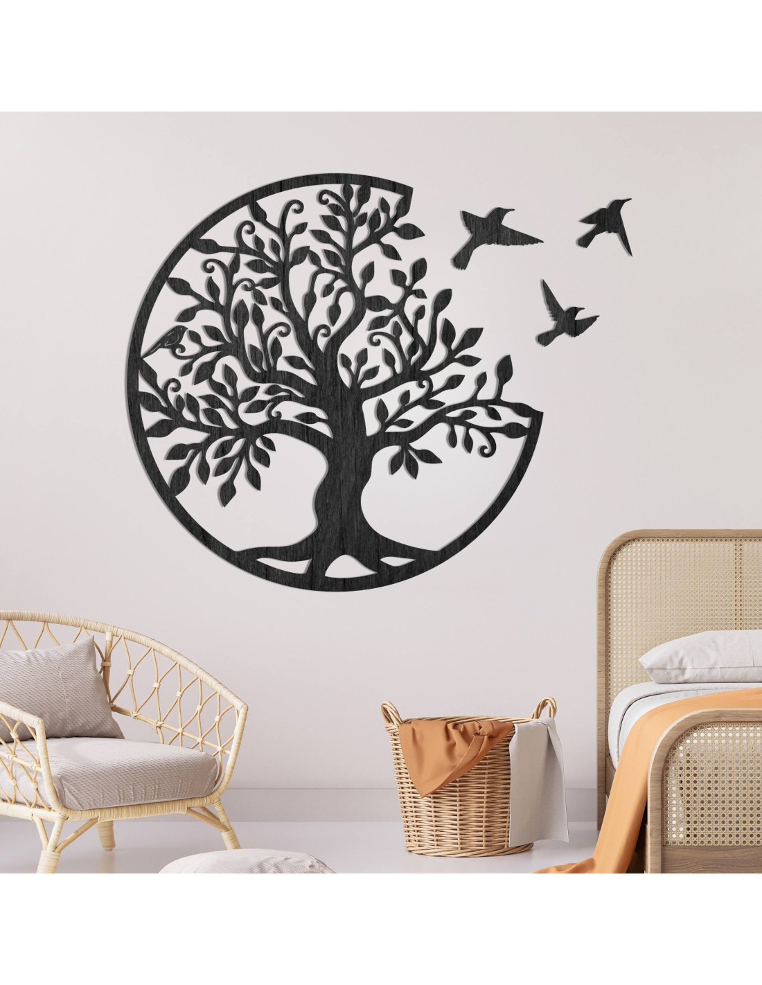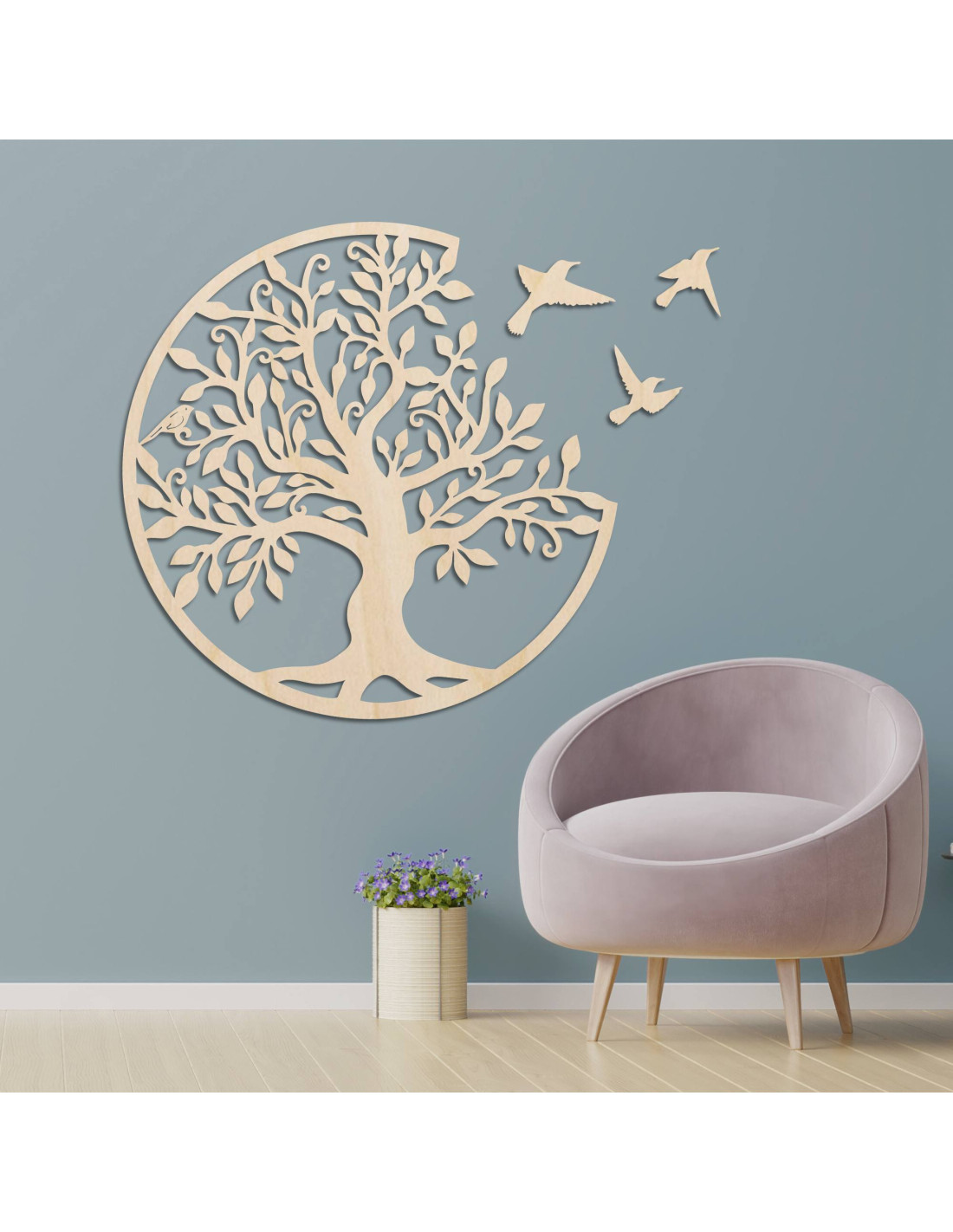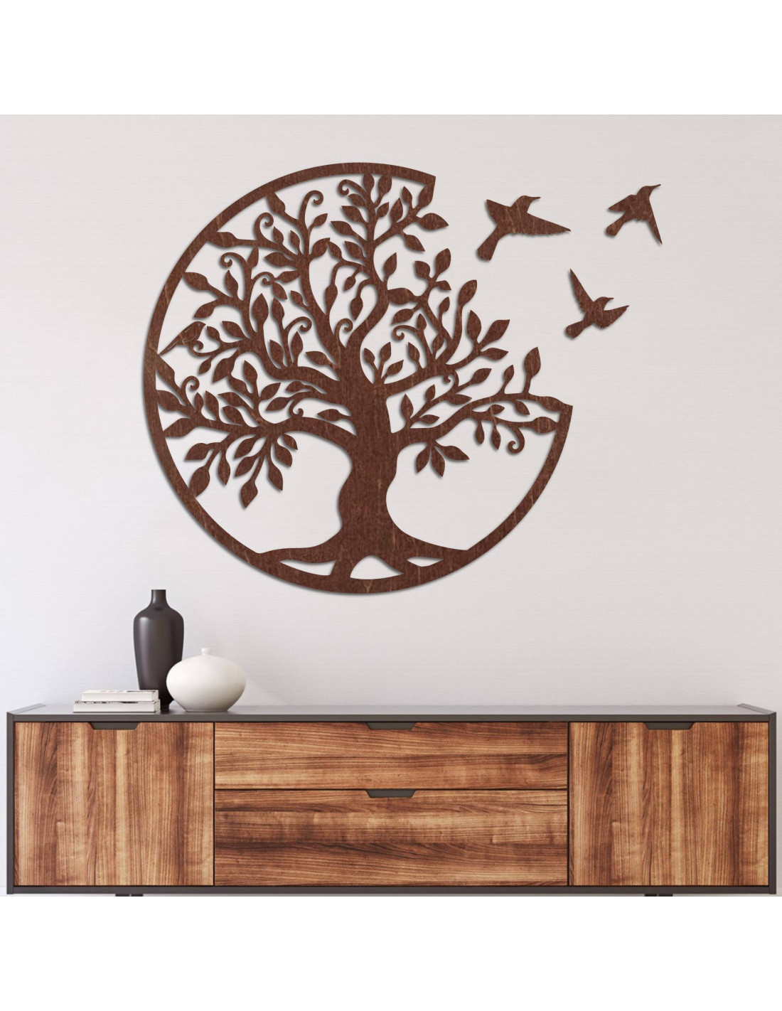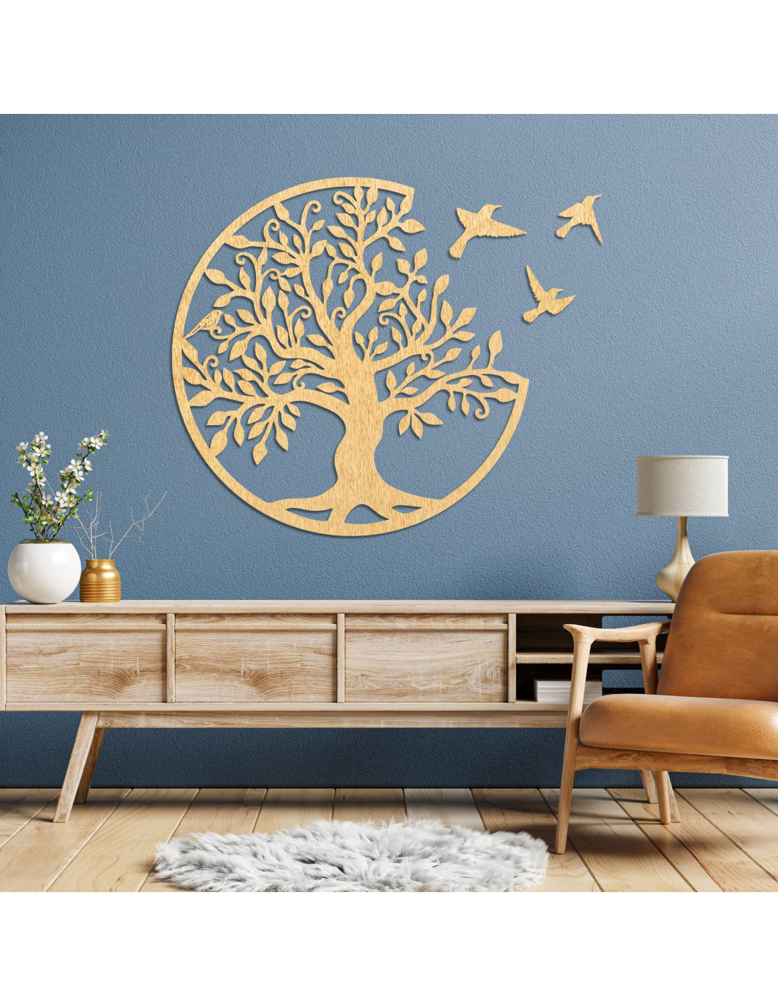 Dřevěný strom života se třemi ptáky letícími doprava je elegantní dekorací na zeď, která přinese vašemu interiéru styl a harmonii.