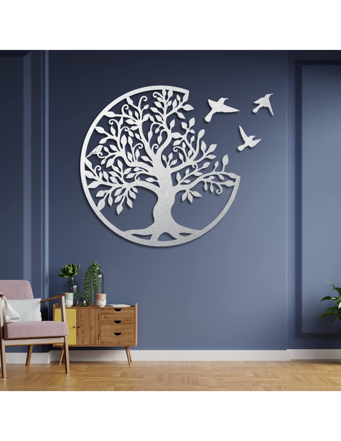 Strom života s létajícími ptáky symbolizuje svobodu, růst a harmonii přírody v elegantním moderním provedení