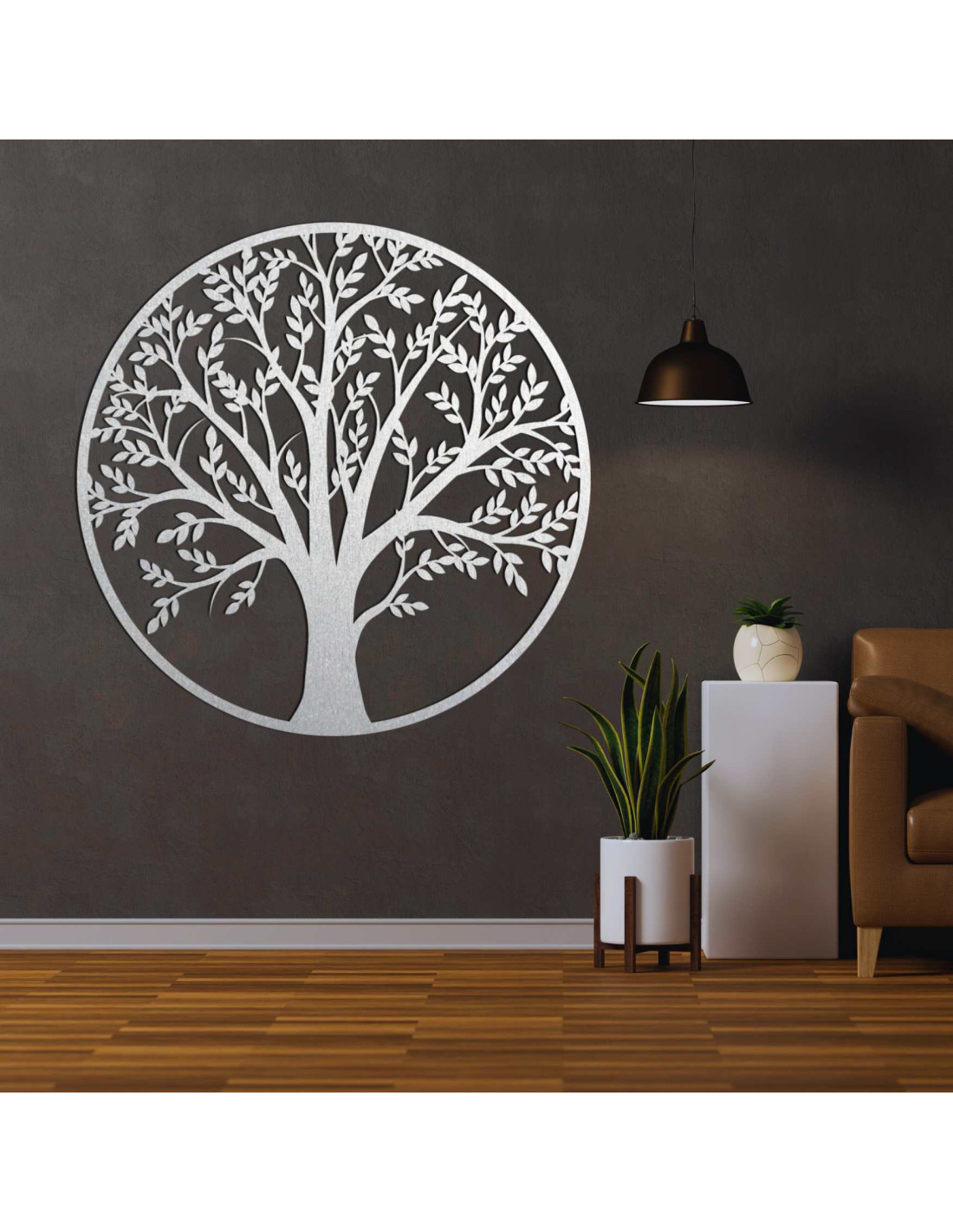 Stylový strom života ze dřeva v kruhovém designu. Přírodní dekorace, která dodá prostoru teplo a jedinečný charakter.