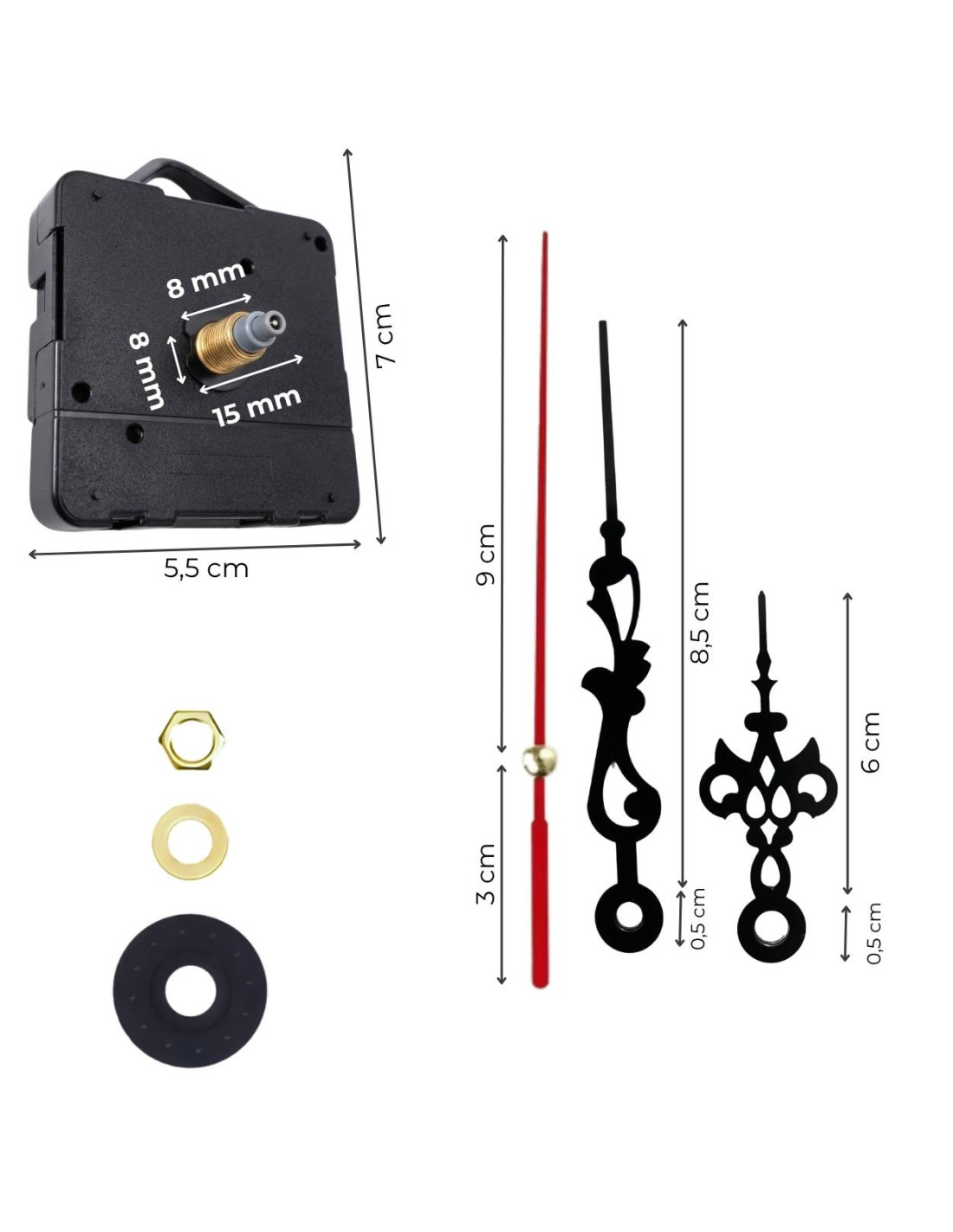 - Obsah sady: gumová podložka, kovová podložka, středová matice, QUARTZ strojek, hodinová, minutová a vteřinová ručička