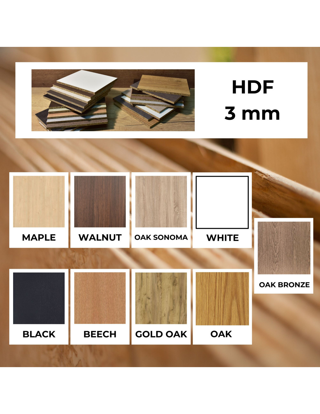 • Překližka má tloušťku 5 mm / HDF má tloušťku 3 mm.