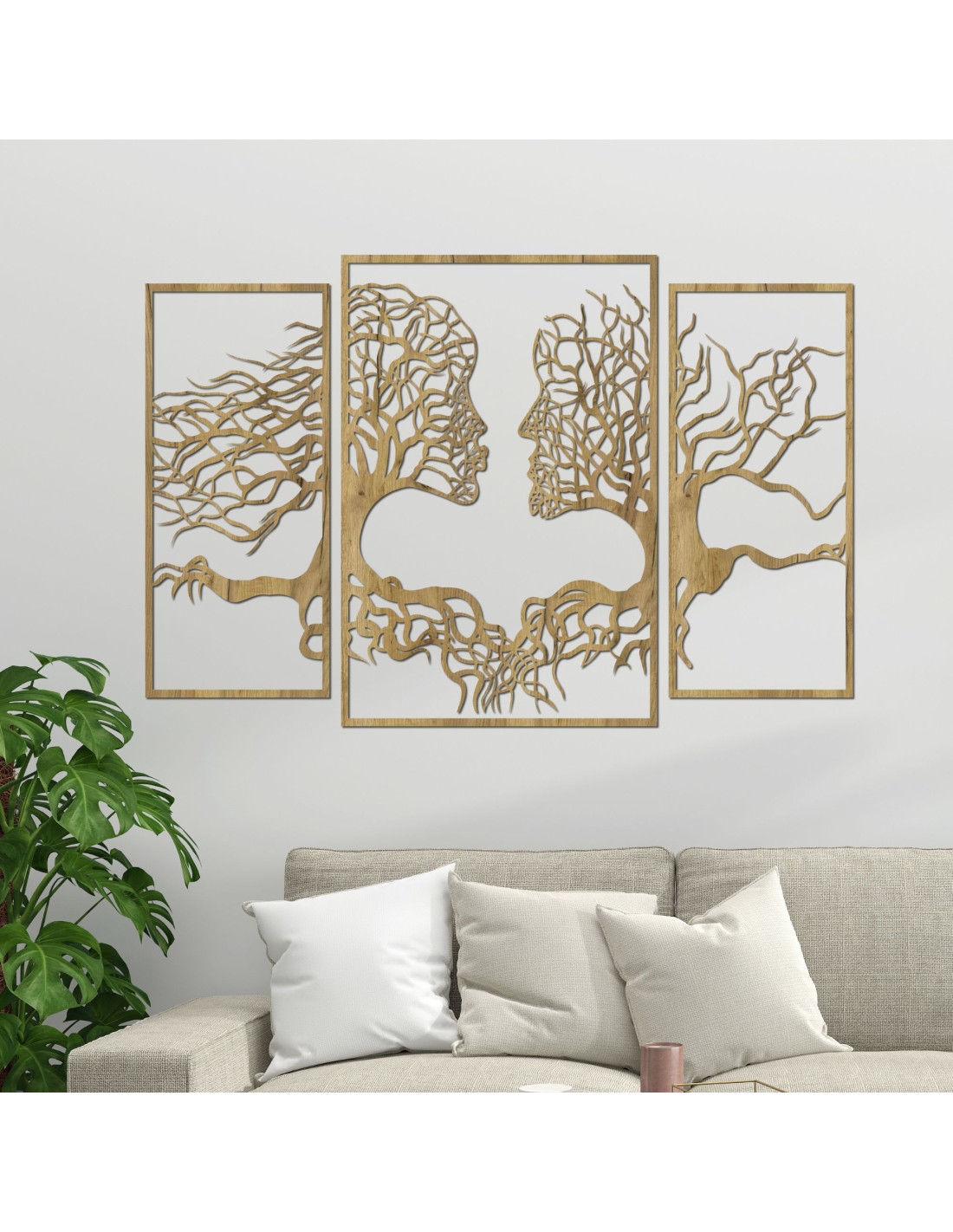 Dřevěný obraz na stěnu tváře a stromy znázorňují spojení mezi člověkem a přírodou